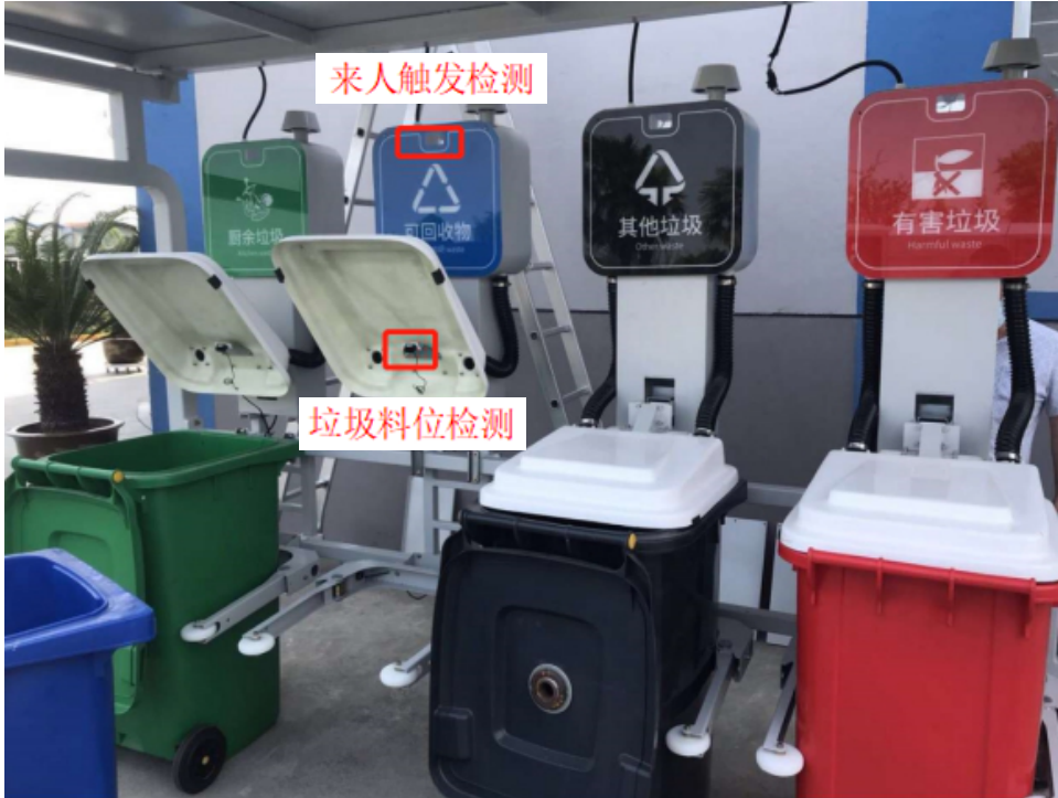 1.垃圾桶智能开盖系统:产品配备自动开盖系统,居民投放垃圾时通过垃圾亭上的北醒激光雷达自动感应(探测前方来人,斜向下安装,检测身高130cm以上人员),自动打开桶盖,有效避免双手接触到垃圾桶,减少细菌的接触传播,提高居民垃圾投放的舒适性。