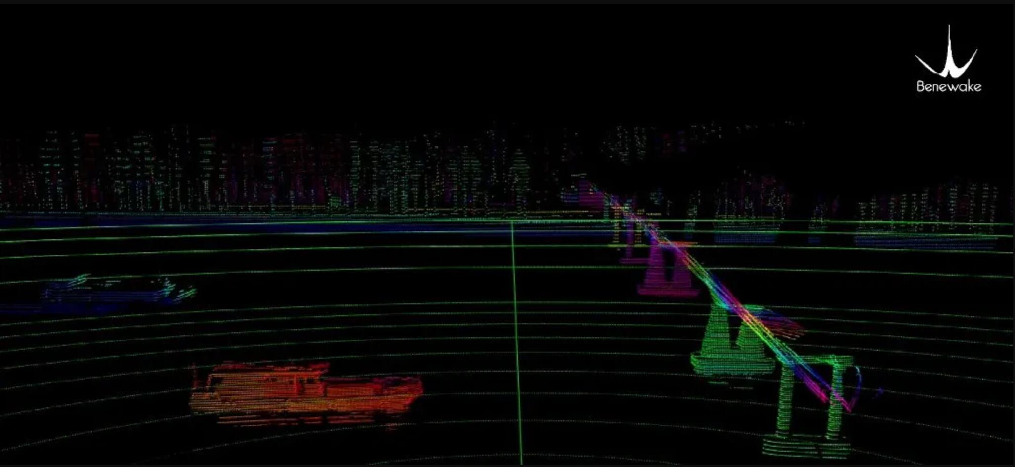 4. 实用性和创新性强,可扩展流量统计应用除去自动识别目标物的位置、大小、尺寸等信息,动态抓取入侵物体轨迹信息,实时预警区域内人员入侵或异常事件。还可以结合场景需要作流量统计的解决方案。例如,高峰期内入口a到桥梁b的船舶流量管理或交通流量分析。图5 通航区域内Horn系列激光雷达检测有2条船只通过桥梁