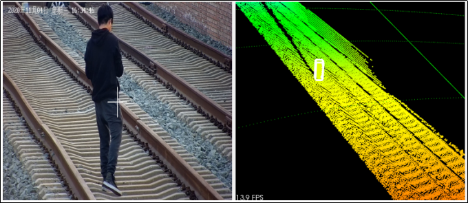 5. 总体成本比基于摄像头的同类方案低多达10倍Horn系列激光雷达可以辅助用户一次性覆盖类似铁路、机场、港口等大型区域,比普通摄像头或光栅所需的数量少得多,减少了施工和布线的复杂工作带来的工程成本,总成本低多达10倍。02.方案应用应用A:人员闯入铁路沿线轨道区域预警图6 轨道禁行区有人员闯入的抓拍图(左)