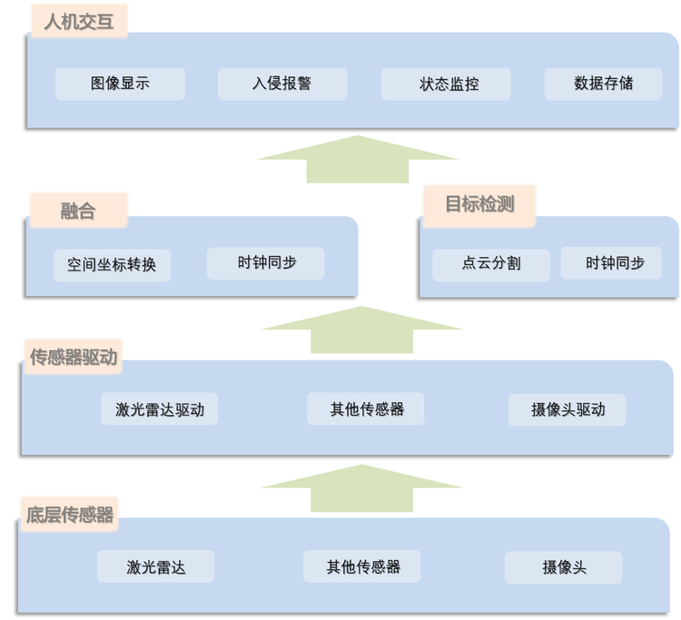 激光雷达入侵监控系统不仅可以检测入侵人员,且可以在大场景范围内锁定微小目标物。系统前端的智能算法,可以检测ROI区域(自定义区域)中的是否存在人员或物品。如有就立即发出警报通知。告警延迟不超过2秒。后端系统接受警报并处理,包括声光提醒,人员图片和告警视频存储等。03.方案组成· 支持多类型传感器配置,如固态激光雷达、摄像头等,接入及数据融合· 兼容多种系统对接,将数据对接已有平台系统图8 系统架构图