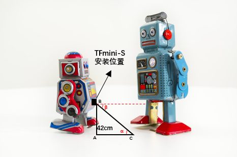 举个例子:如图6所示,当激光雷达安装高度42cm,即图中AB=42cm;∠a=30°,根据三角函数得出BC=42/Sin∠a=84cm。总结:角度∠a参数建议在:20°-60°,安装高度建议在30-50cm,否则会造成精度降低和有效量程缩短。03案例分享一、平衡车机器人机身距离地面42cm高度处,安装2台TFmini-S分别向左下方、右下方探测,机器人直立状态下雷达出光方向与水平地面夹角为15°,机器人在前倾、后仰过程中与地面夹角变化为10~57°,雷达实时探测机器人斜下方的距离并反馈给MCU,MCU结合雷达距离信息和机器人俯仰角度,判断前方是否有台阶、凹陷,进而做出减速、刹车或转向等动作。二、防疫机器人机器人机身距离地面30cm高度处,安装1台TFmini-S与地面夹角16°,倾斜探测斜下方1.1m处的障碍物,当有台阶时,雷达距离会变大,机器人根据雷达数据的变化可以做出减速直至停止运动的反应。三、清扫机器人机器人机身距离地面50cm高度处,安装1台TFmini-S与地面夹角约30°,倾斜探测斜下方1m处的障碍物,当有台阶时,雷达距离会变大,机器人根据雷达数据的变化可以做出减速直至停止运动的反应。四、巡检机器人机器人机身距离地面15cm高度处,安装1台TFmini-S与地面夹角约60°,倾斜探测斜下方的障碍物,当有台阶或凹坑时,雷达距离会变大,机器人根据雷达数据的变化可以做出减速直至停止运动的反应。五、医院搬运机器人机器人机身距离地面10cm高度处,安装1台TFmini Plus,倾斜探测前方50cm范围内是否有台阶、凹坑等影响机器人行进的物体,当雷达探测到距离发生较大变化时,机器人会做出减速停止的动作,避免整个机器人发生跌倒、损坏等事故。更多联系方式:电话:400-880-9610邮箱:bw@benewake.com 在线咨询:点击咨询