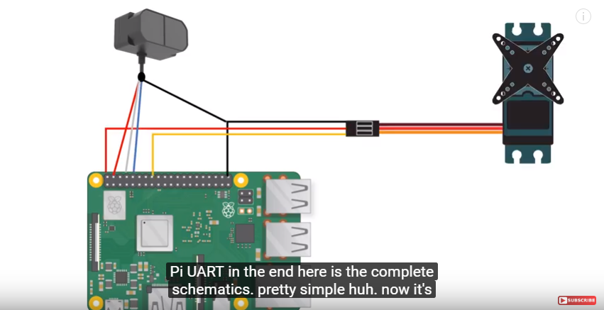 大叔通过自制转接板将TFmini Plus与Raspberry Pi串口结合,然后将舵机的5V电源线、地线、输入/出口分别与之相连,下图为整体电路原理图。