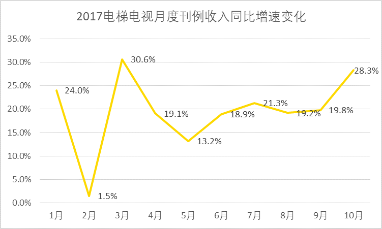 表一、2017年电梯电视月度刊例收入同比增速变化