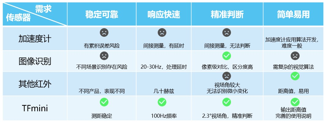 TFmini自身优势明显,满足金主爸爸需求:1、技术优势:精度高,视场角小可稳定识别距离的变化,以保证广告在正确时间精准投放;抗环境干扰性强,性能稳定;人眼安全认证通过,避免伤害客户2、实施优势:便于集成在投影设备中,直接整体安装在电梯上方即可3、价格优势:消费级价格TFmini与其他监测电梯开关产品竞争对比:图3 TFmini与其他监测开关产品竞品对比图