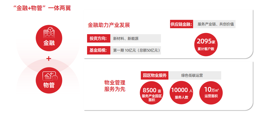 金融服务事业部以“金融+园区服务”为双翼,依托集团雄厚的资金实力和广泛的业务脉络,发挥整体协作优势,深耕金融与物业管理服务领域。