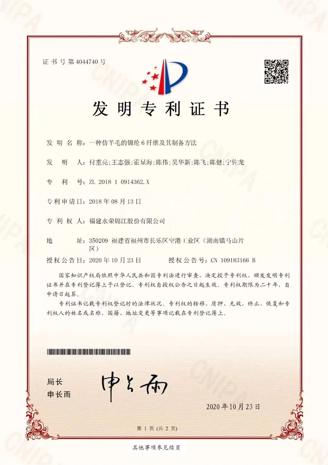 聚酰胺6纤维用蓝相黑母粒及其制备方法与应用发明专利证书(签章)