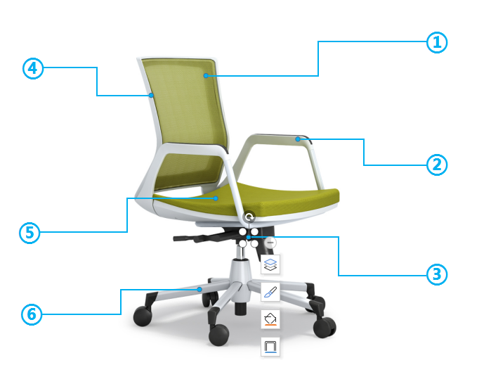 1.Backrest: self-supporting backrest construction with polyester mesh and white polyamide plastic (100% recyclable).