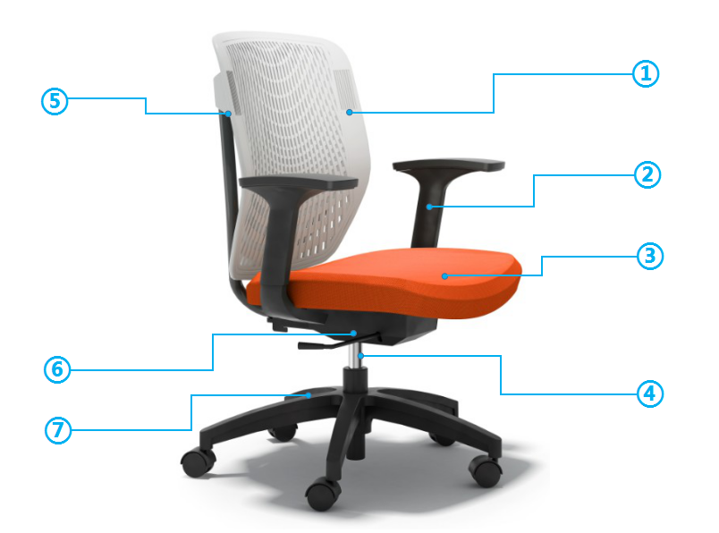 The seat consists of moulded polyurethane foam on a 2-piece shell structure, injection-moulded in back polypropylene. Seat height is adjustable by means of a pneumatic gas spring.