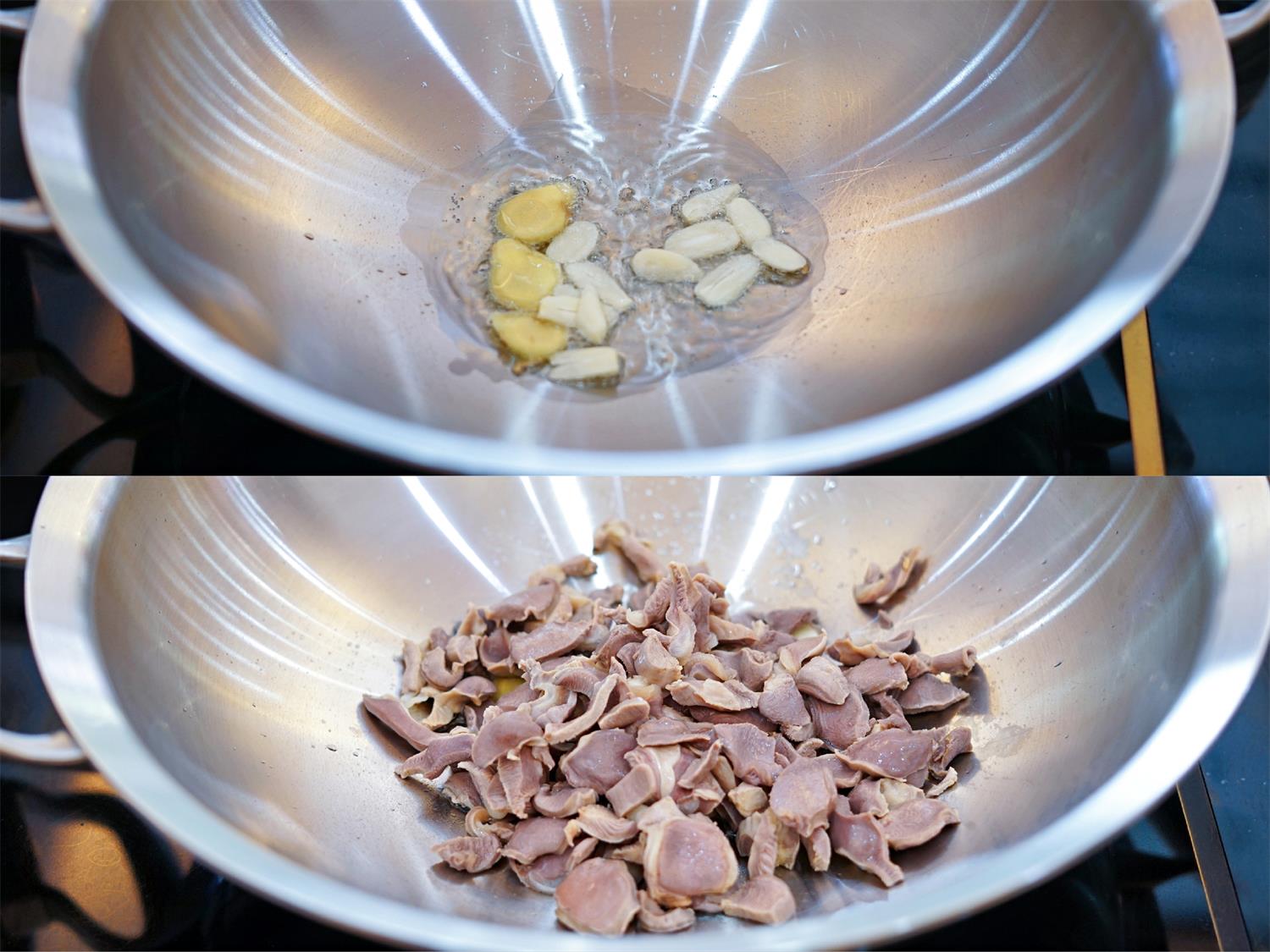 5、起锅烧油,下葱姜爆香,倒入鸡胗快速翻炒均匀。
