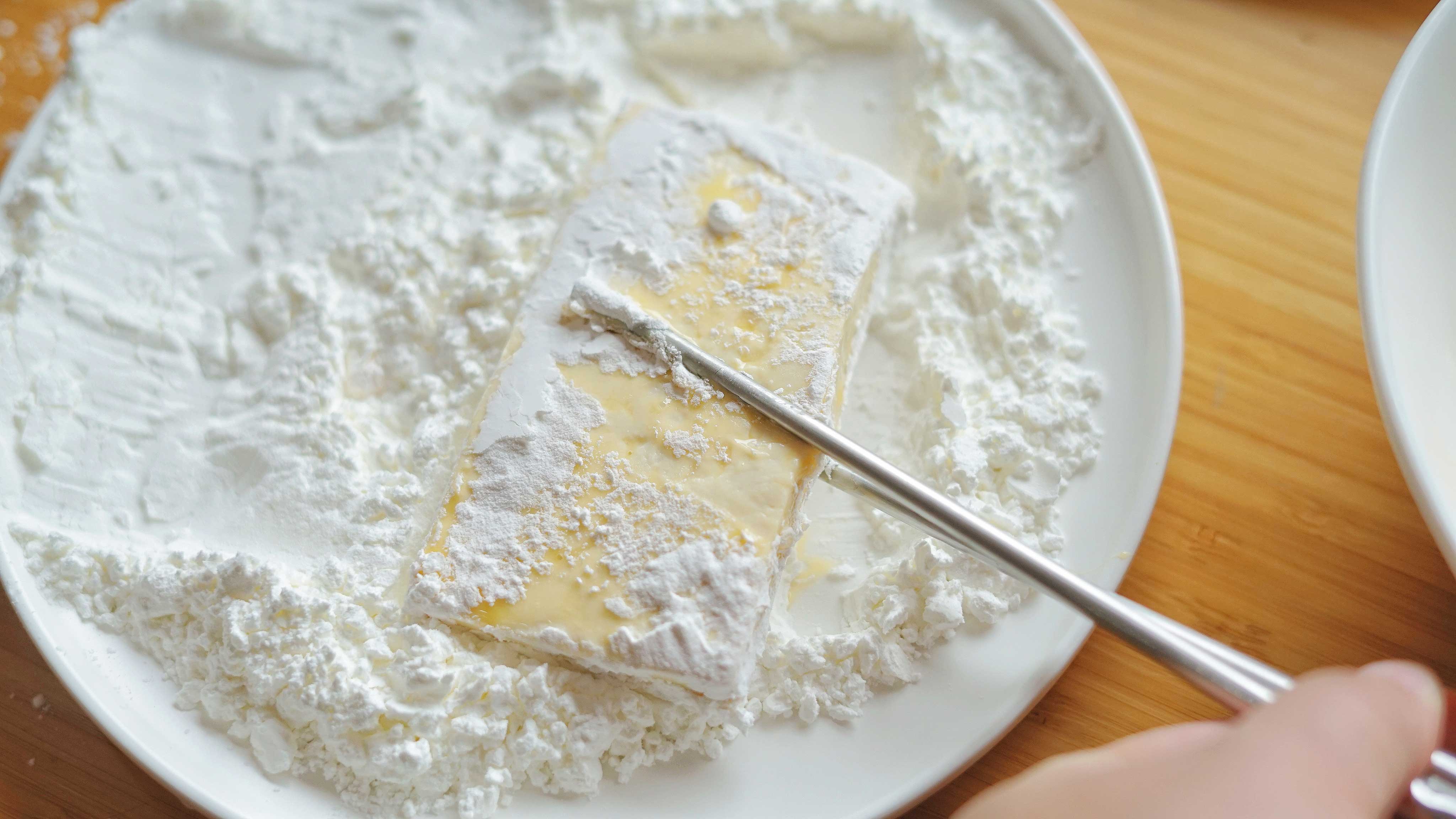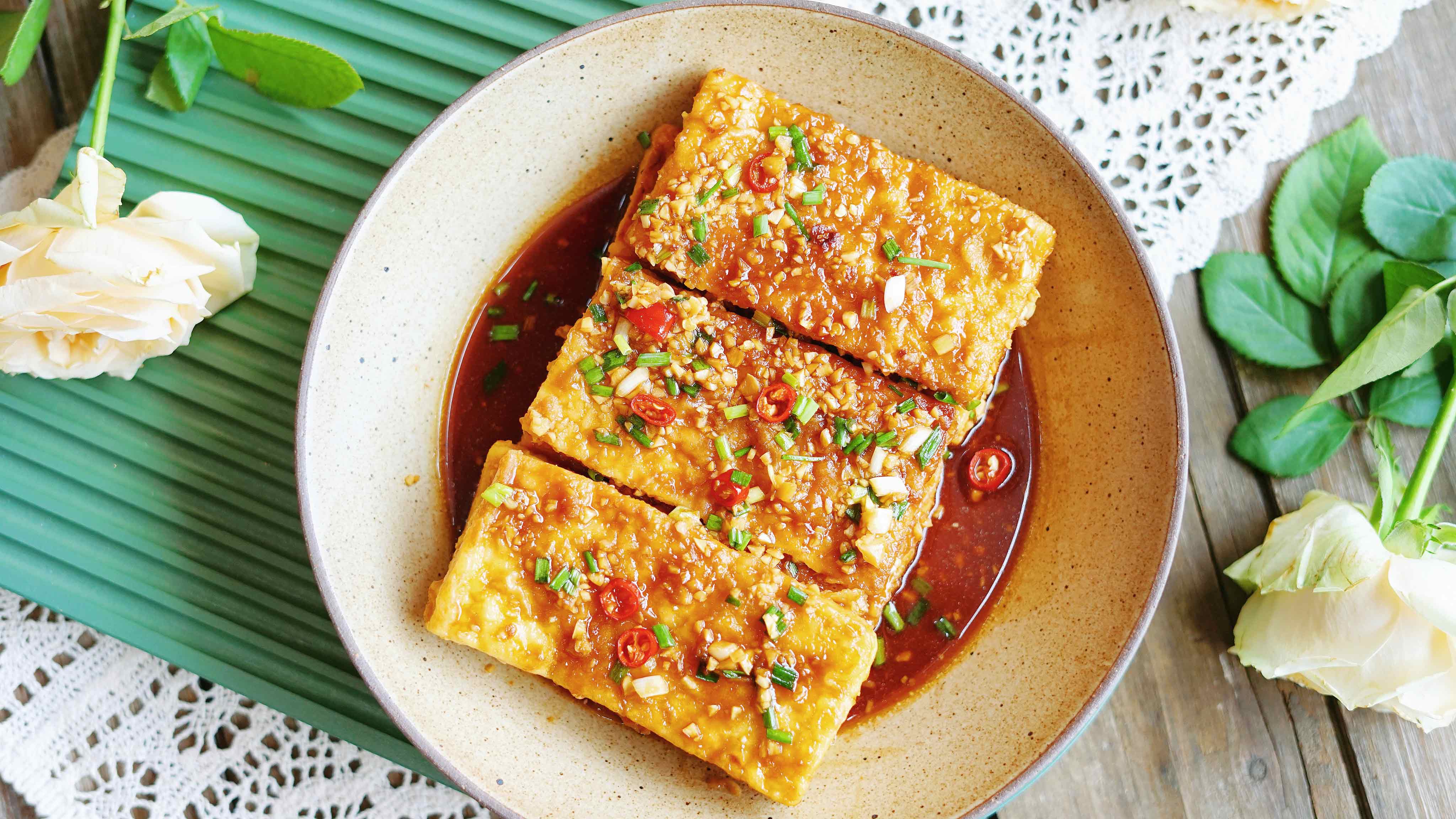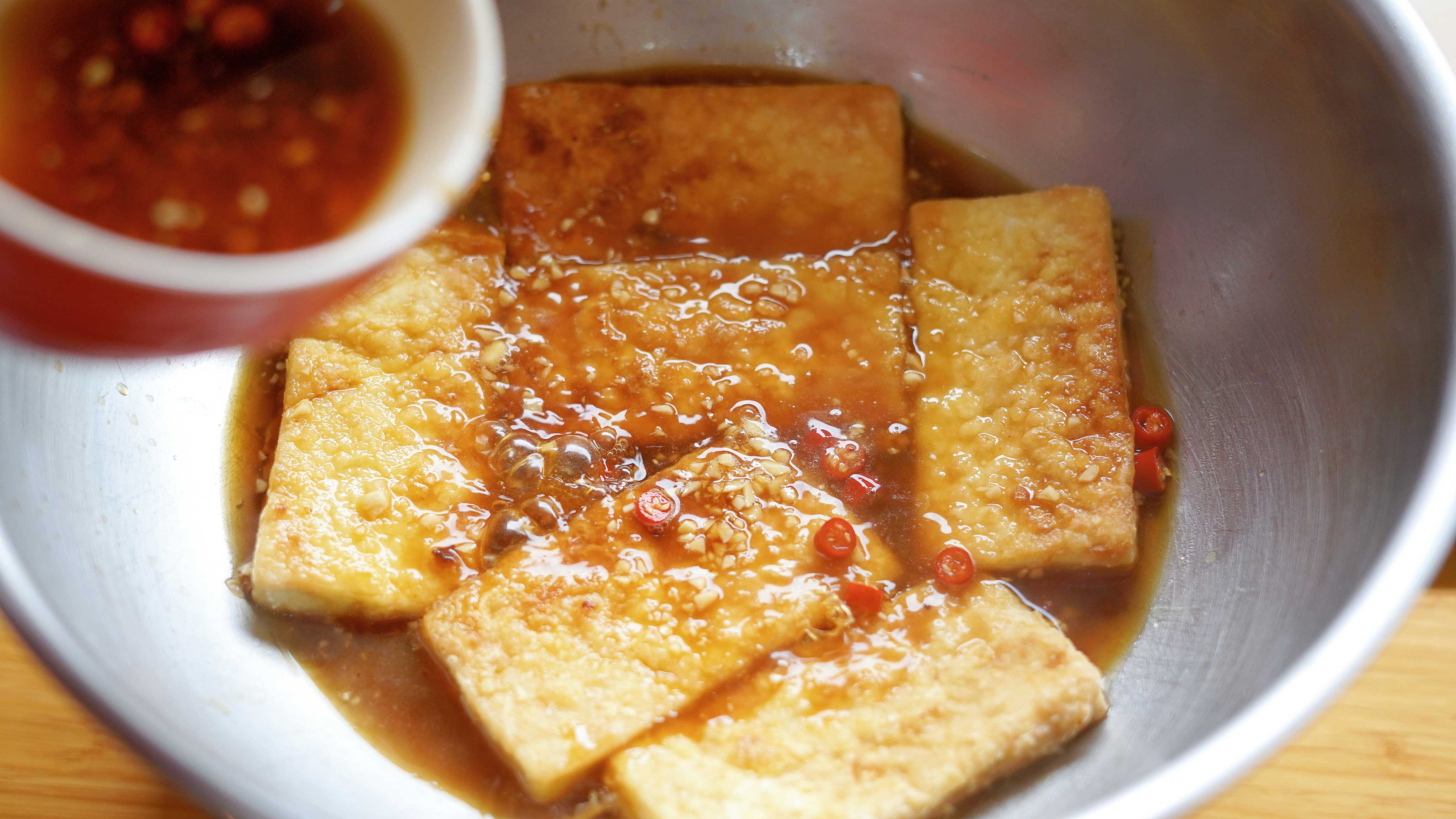 ① 选用老豆腐,嫩豆腐水份太多,煎的时候容易散掉。老豆腐煎之前,将表面的水份吸干,避免煎的时候油溅。