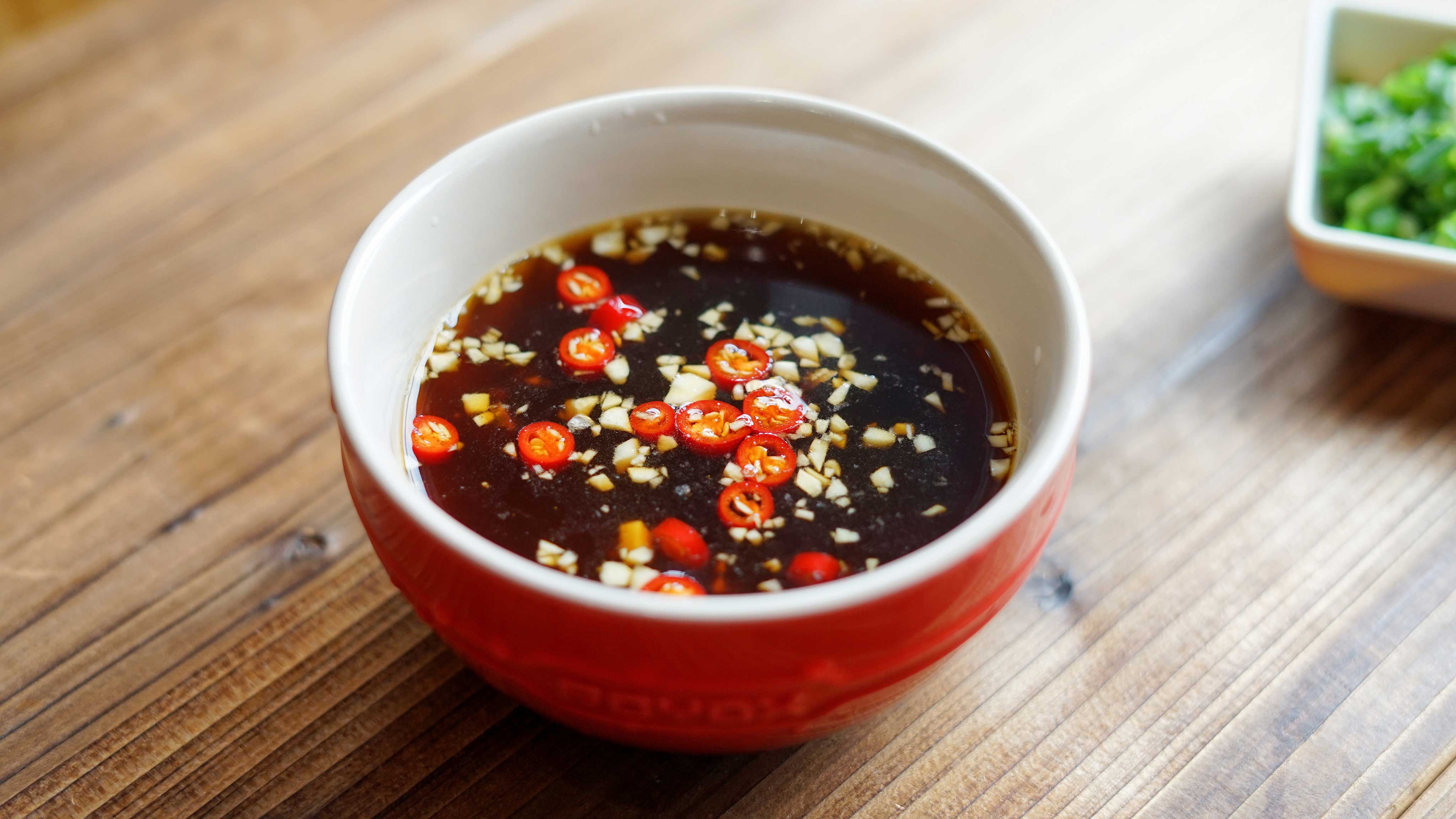 2、调酱汁:在碗里放入切好的蒜蓉+1勺蚝油+2勺酱油+1小勺糖+1小勺盐+小米辣+半碗清水搅匀备用。