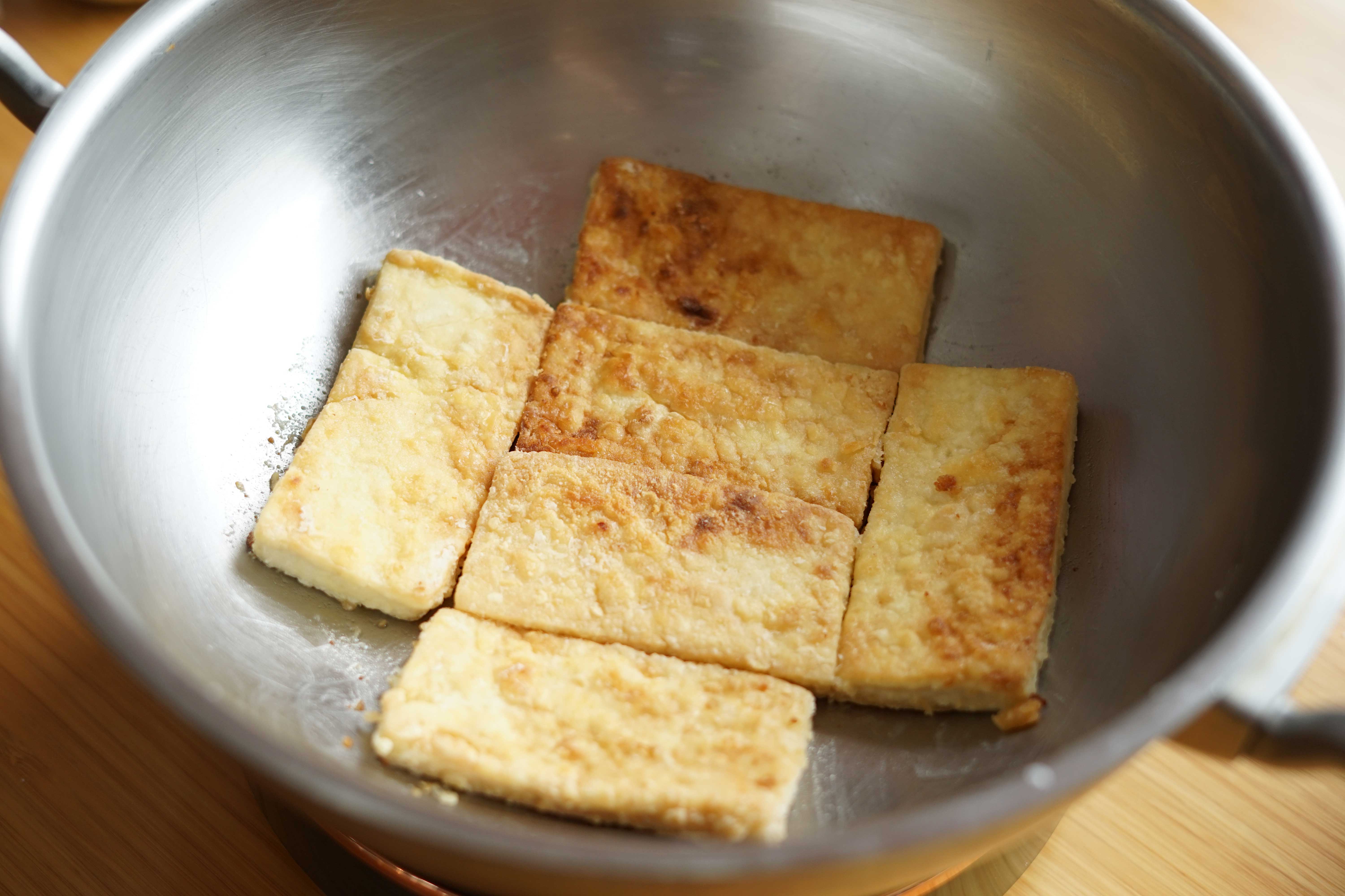 5、把锅预热倒入油把豆腐两面煎至金黄色。