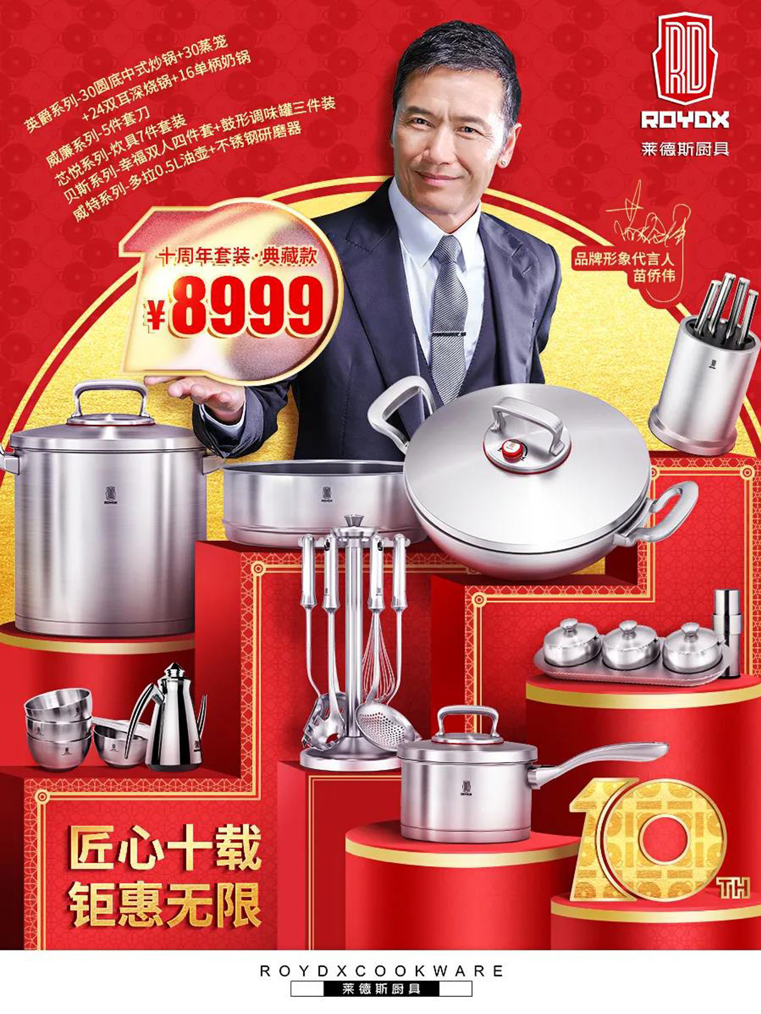 莱德斯10周年典藏款套装,包含炒锅、汤锅、蒸笼、套刀、炊具等;结婚送礼、新屋入住,一套备齐!莱德斯厨具十周年钜惠现已就绪!典藏款套装整体折扣高达5折!现超值总价仅需8999元,即可尊享典藏款厨具10件套,赶紧行动起来吧!