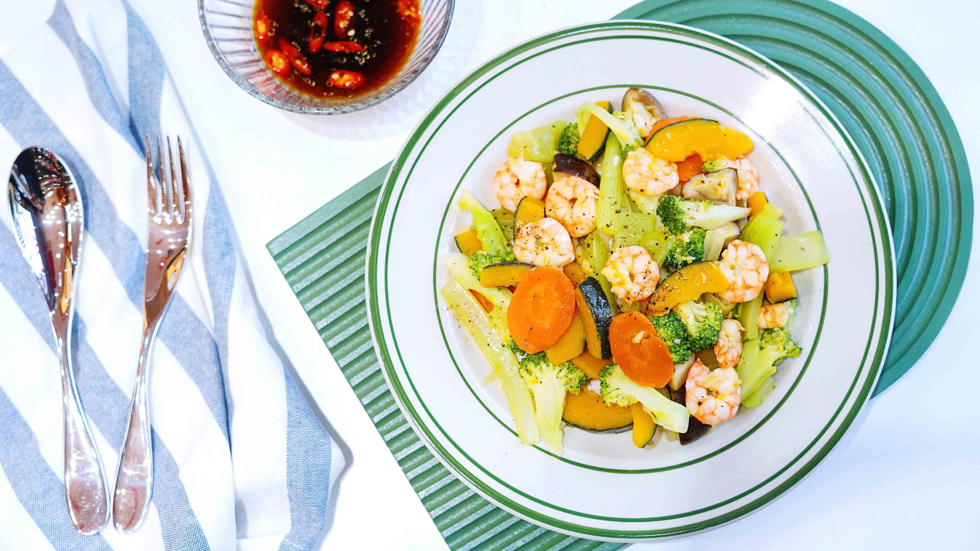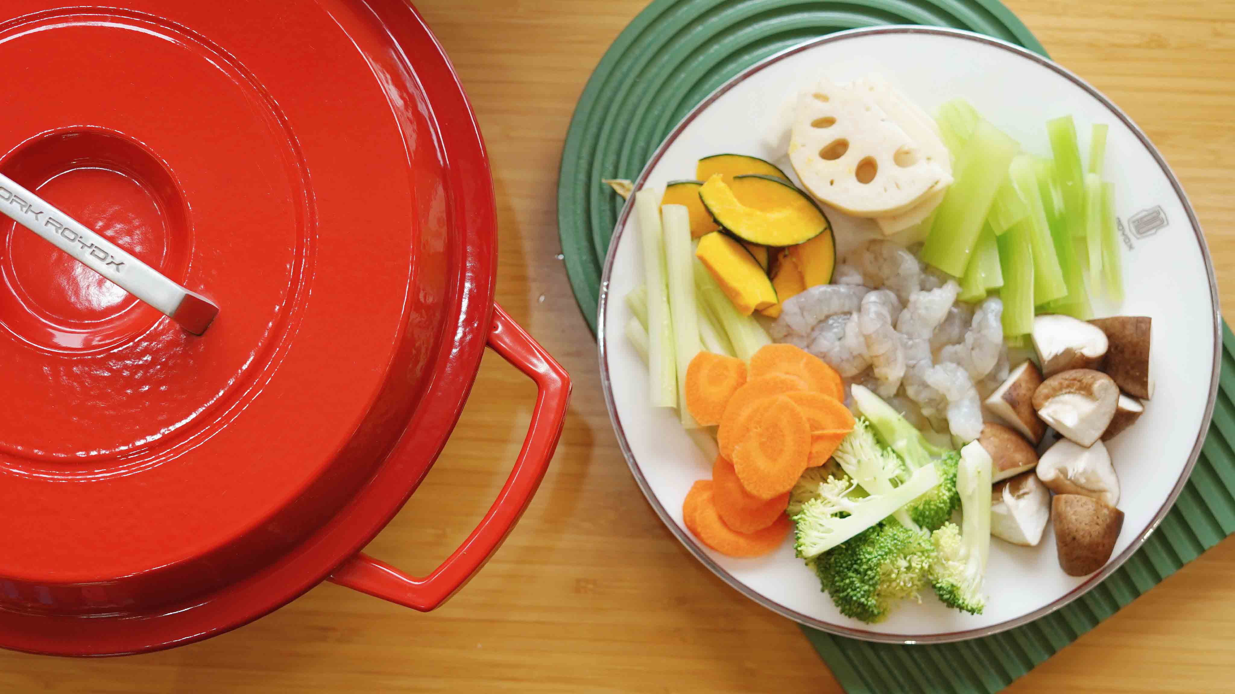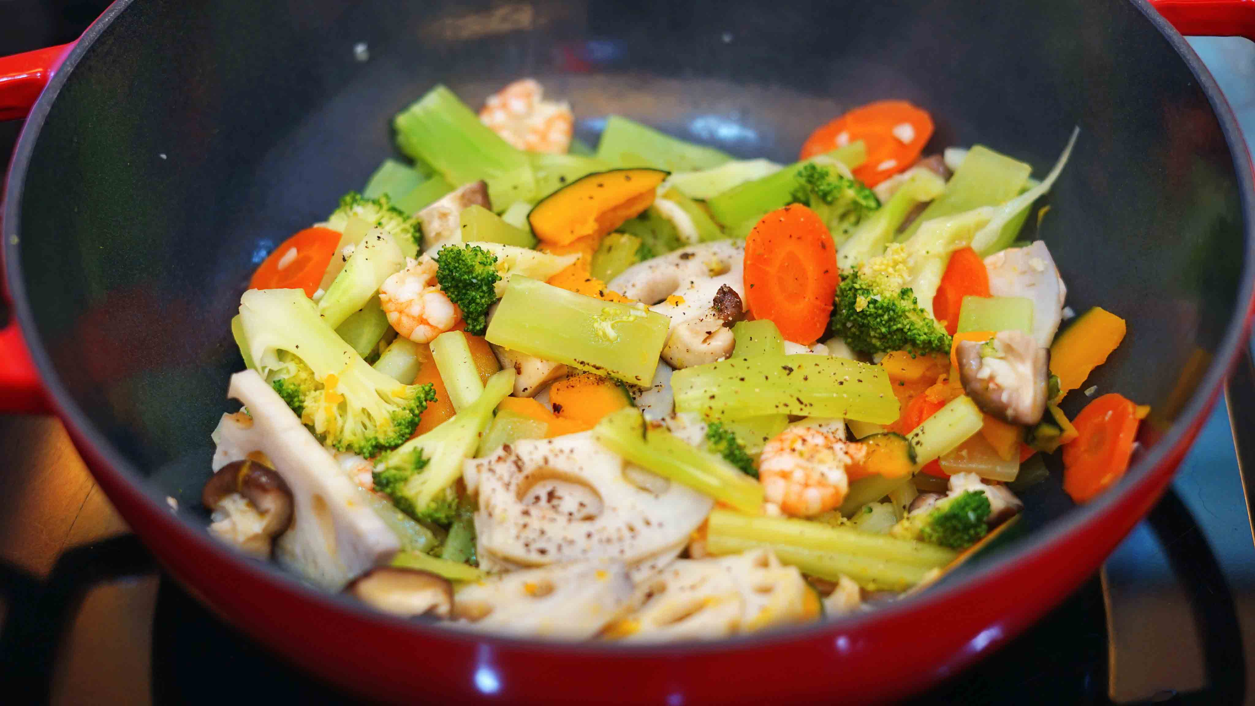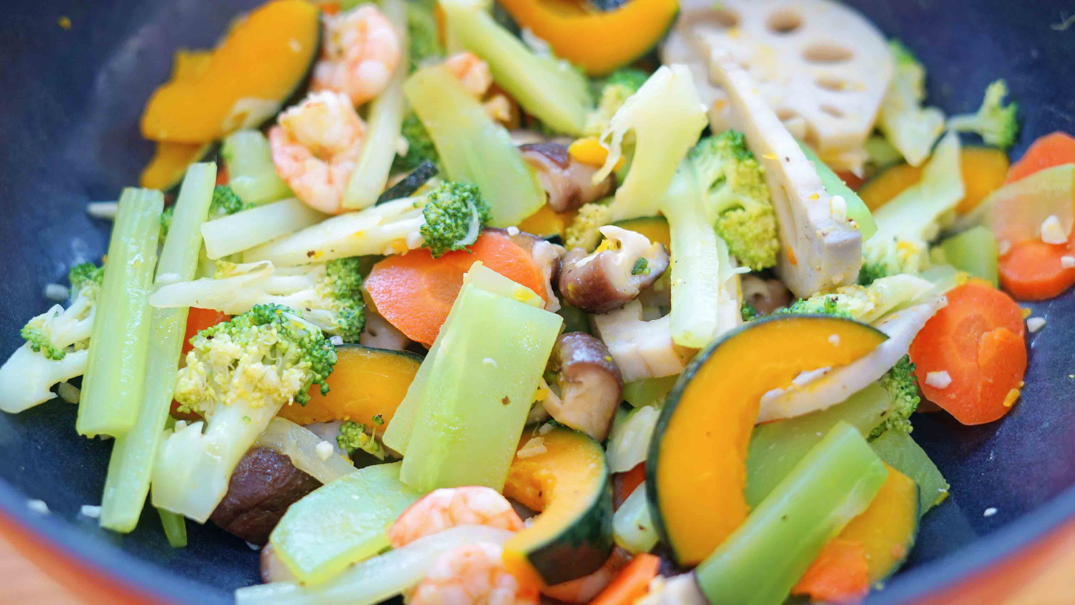 虾仁、贝贝南瓜、西兰花、窝笋、红萝卜、蘑菇、莲藕、西芹等适量