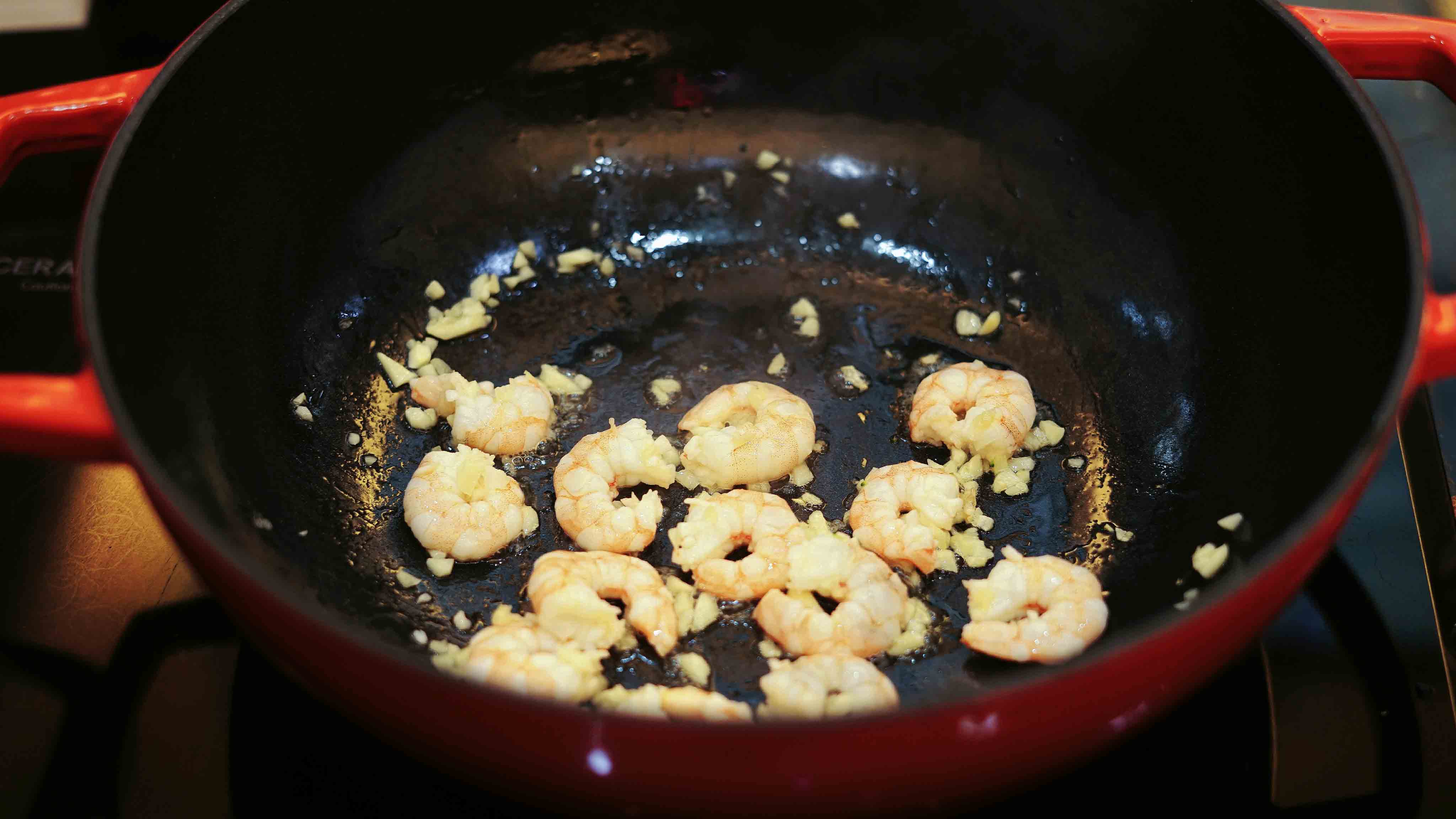 锅里倒入少许橄榄油和蒜末,炒香后放入虾仁炒至变色。