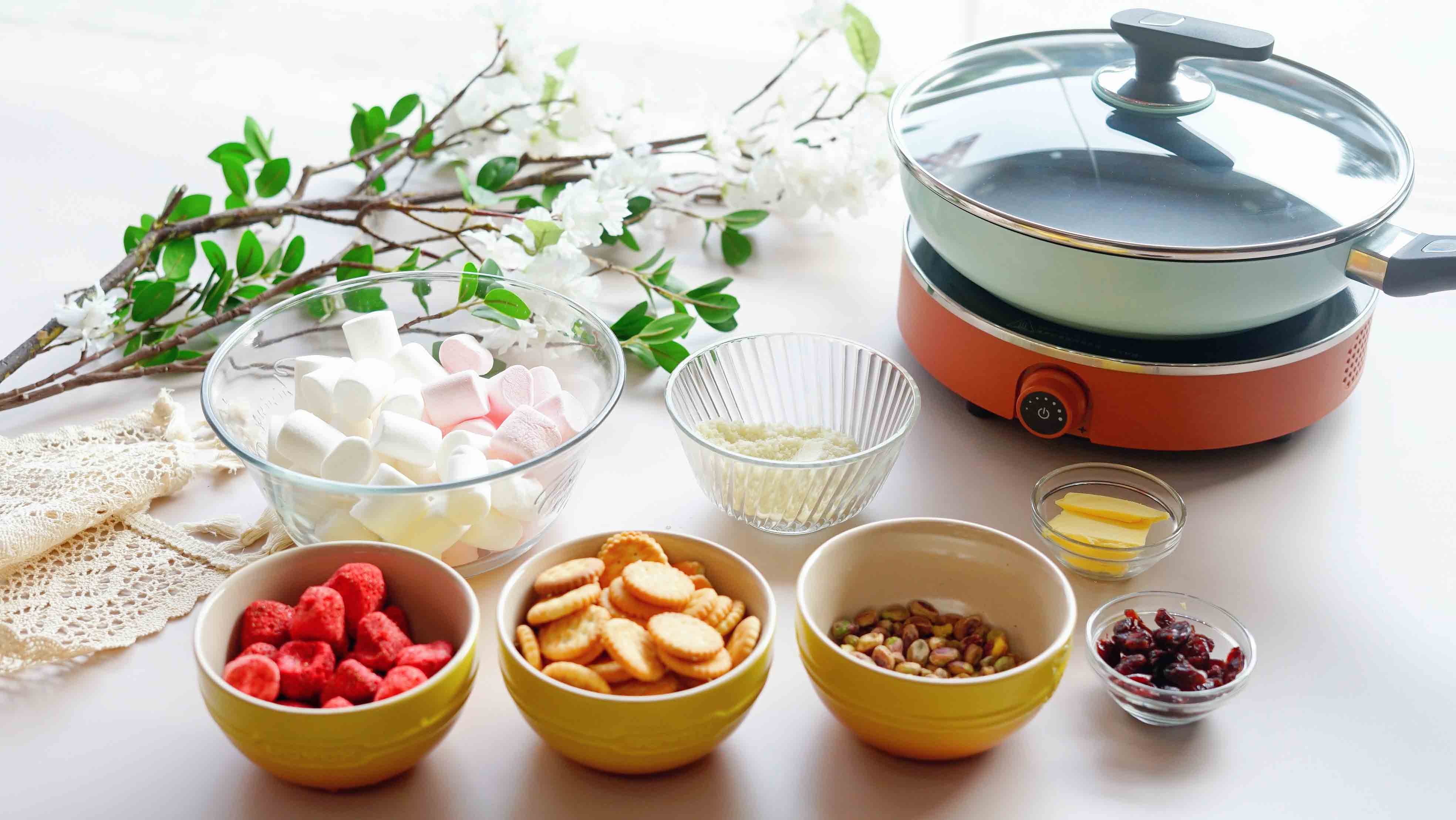草莓冻干18颗左右、奇福饼150g、低糖棉花糖150g、蔓越莓60g、奶粉45g、坚果30g、黄油40g。
