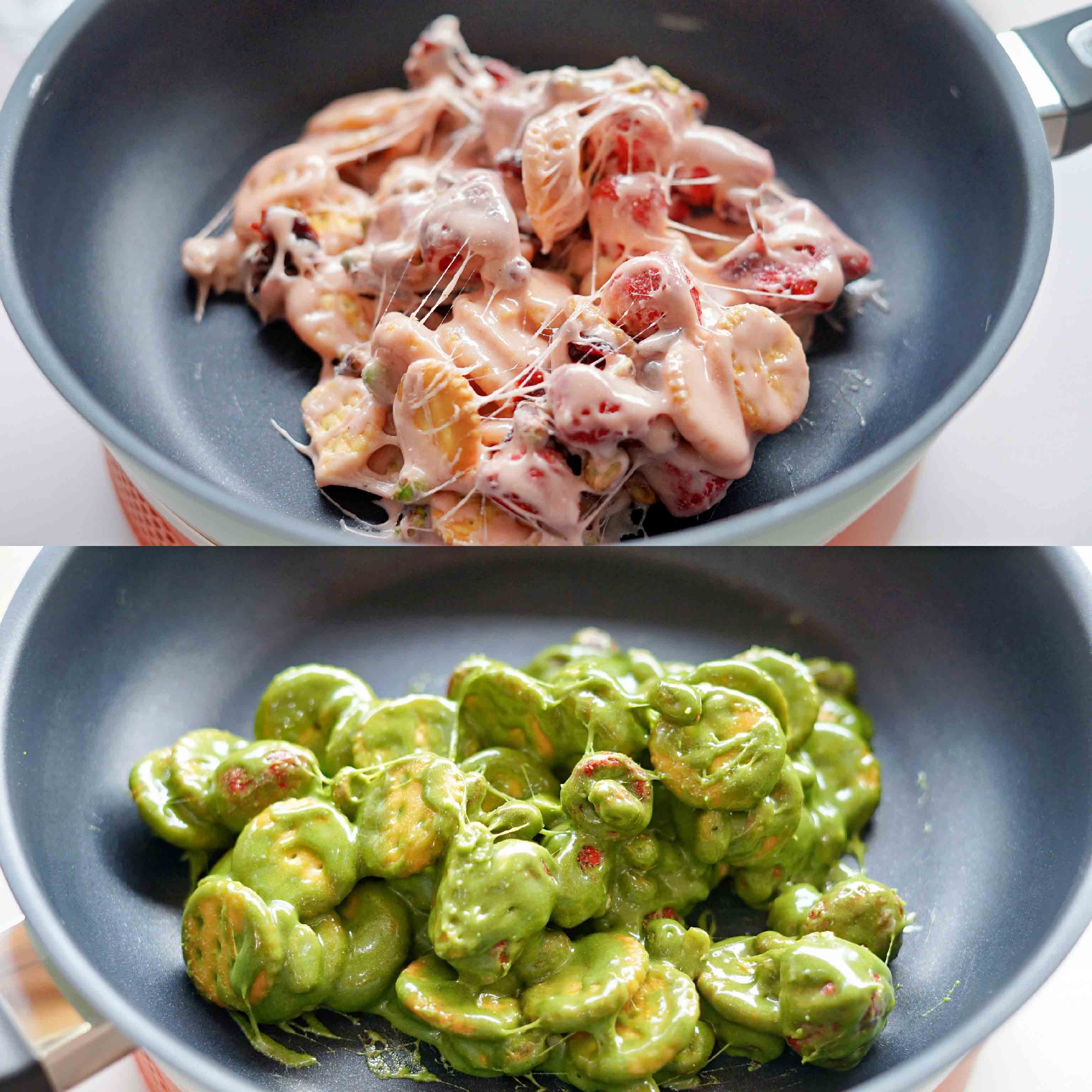 2、棉花糖融化后关火倒入奶粉搅拌均匀。(抹茶草莓雪花酥则是抹茶粉加入奶粉搅拌均匀)