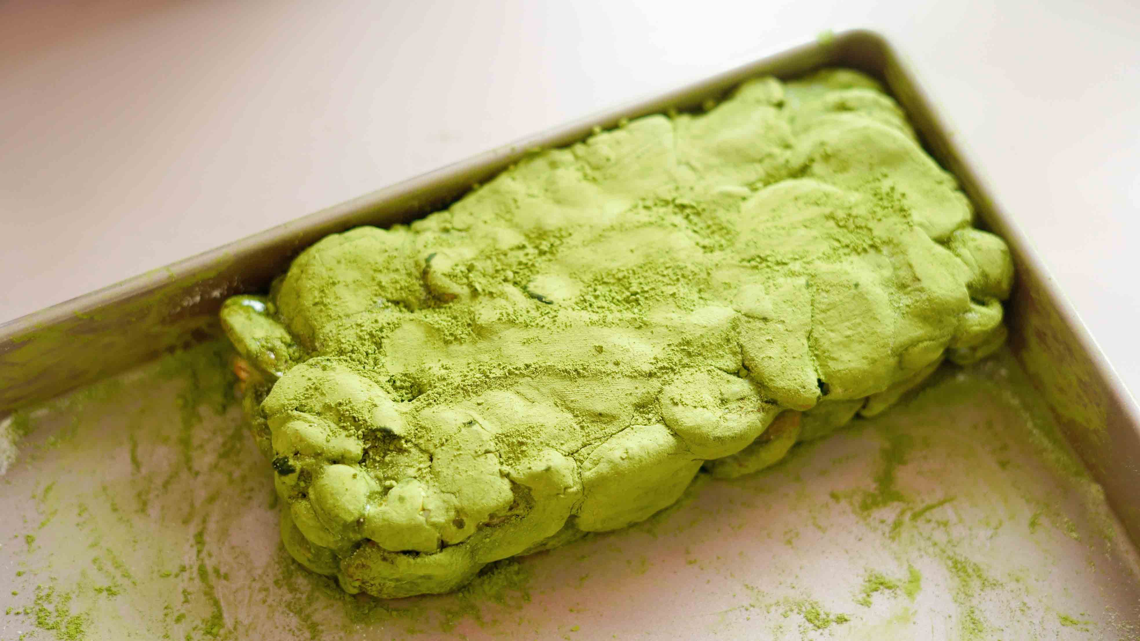 5、放到撒了奶粉的不粘盘撒上放凉至不粘手后,戴上PVC手套揉均匀,让糖尽量包裹住每个材料,让材料平均分布在糖里,用压平器或擀面杖压平整,整的越方正表面越平,后面切出来的成品越好看哦。