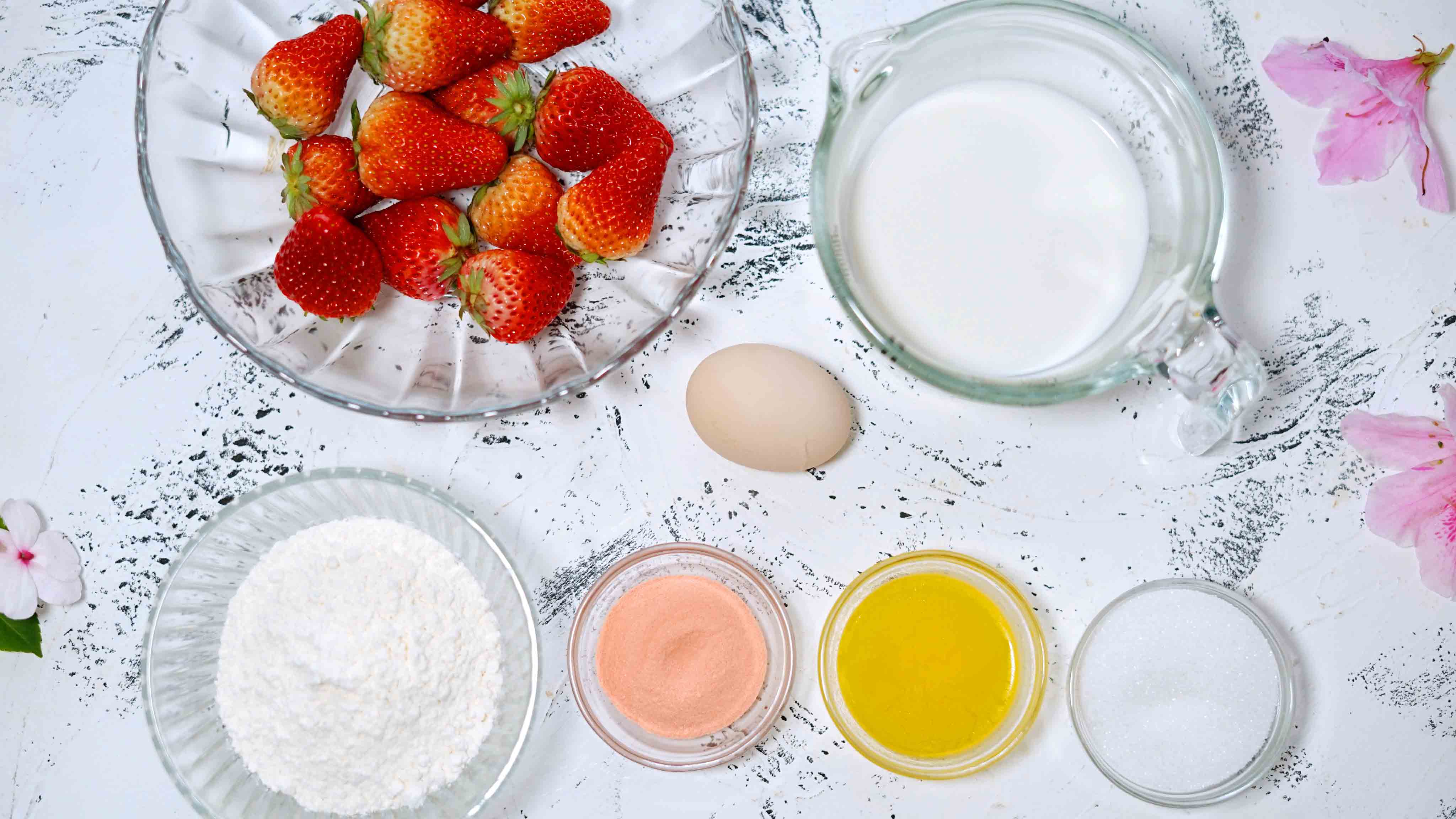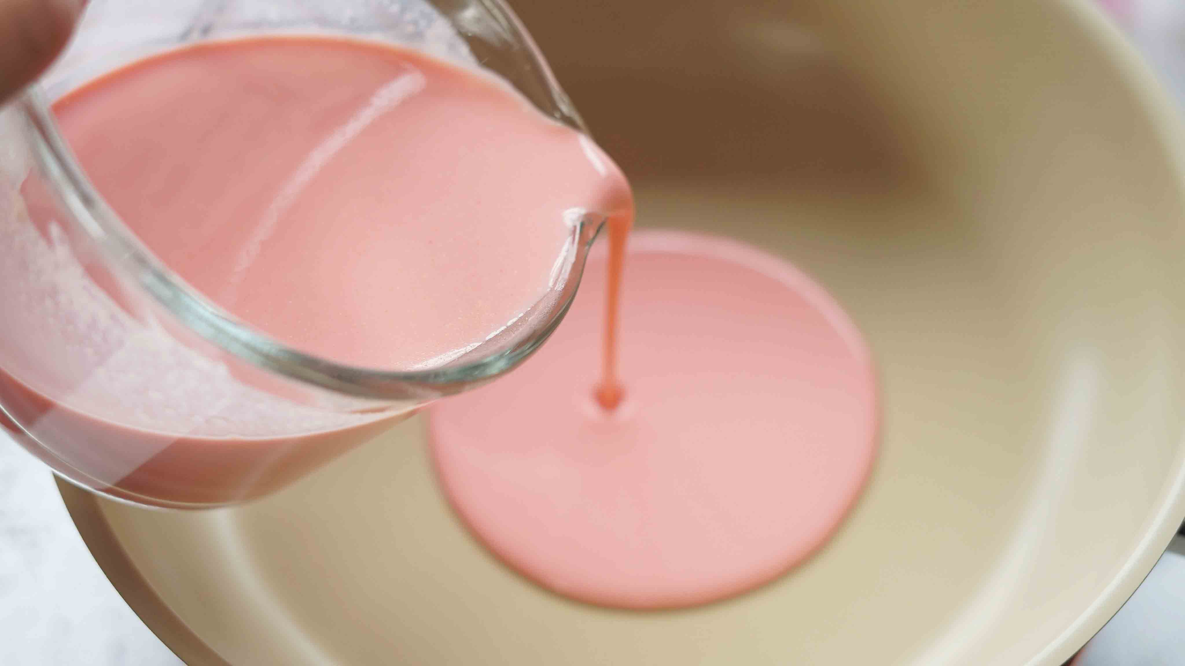 2、倒入240g的牛奶、20g的黄油、几滴的红丝绒香精,80g的低筋面粉和5g的草莓粉过筛,搅拌至无颗粒。