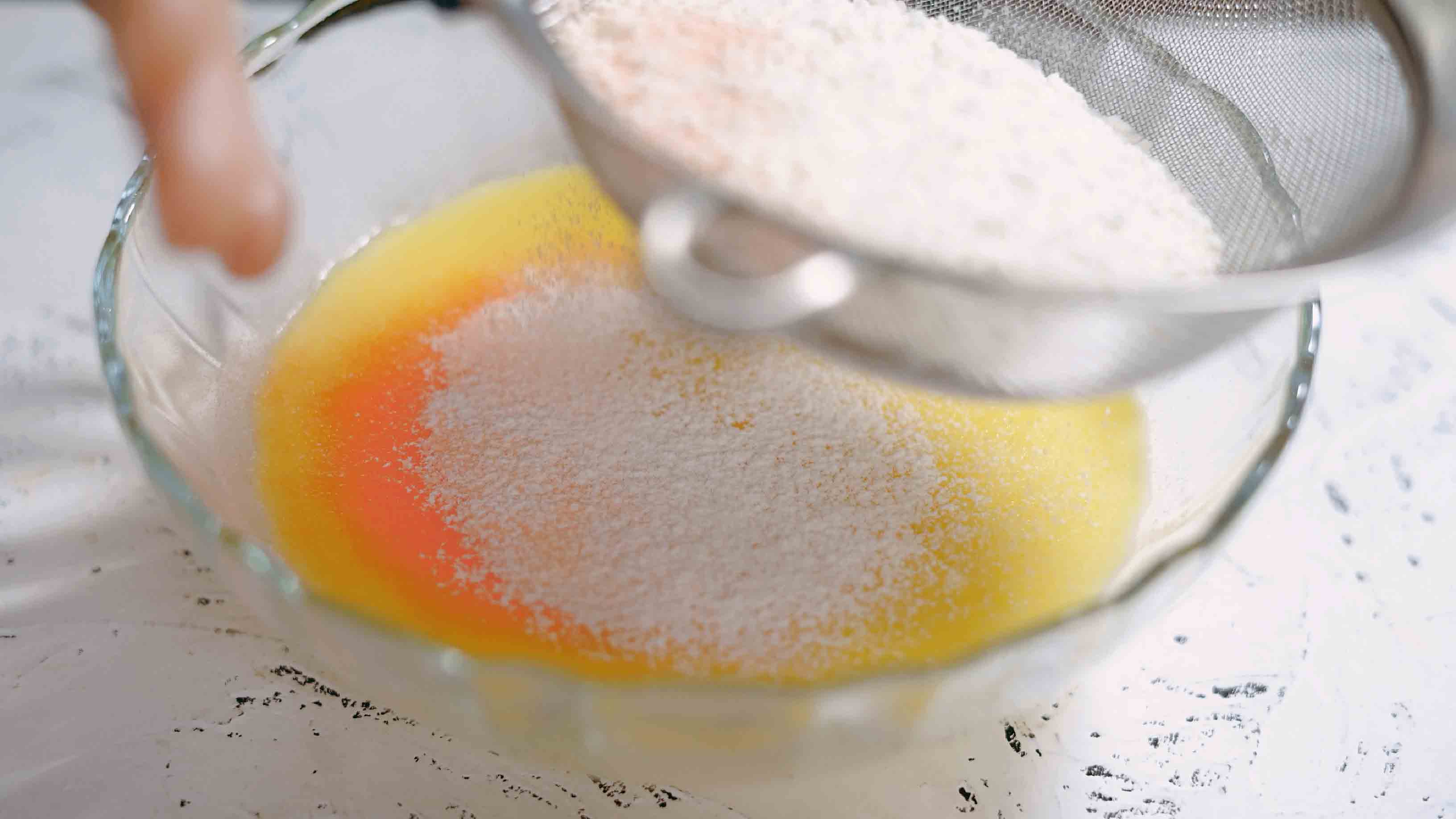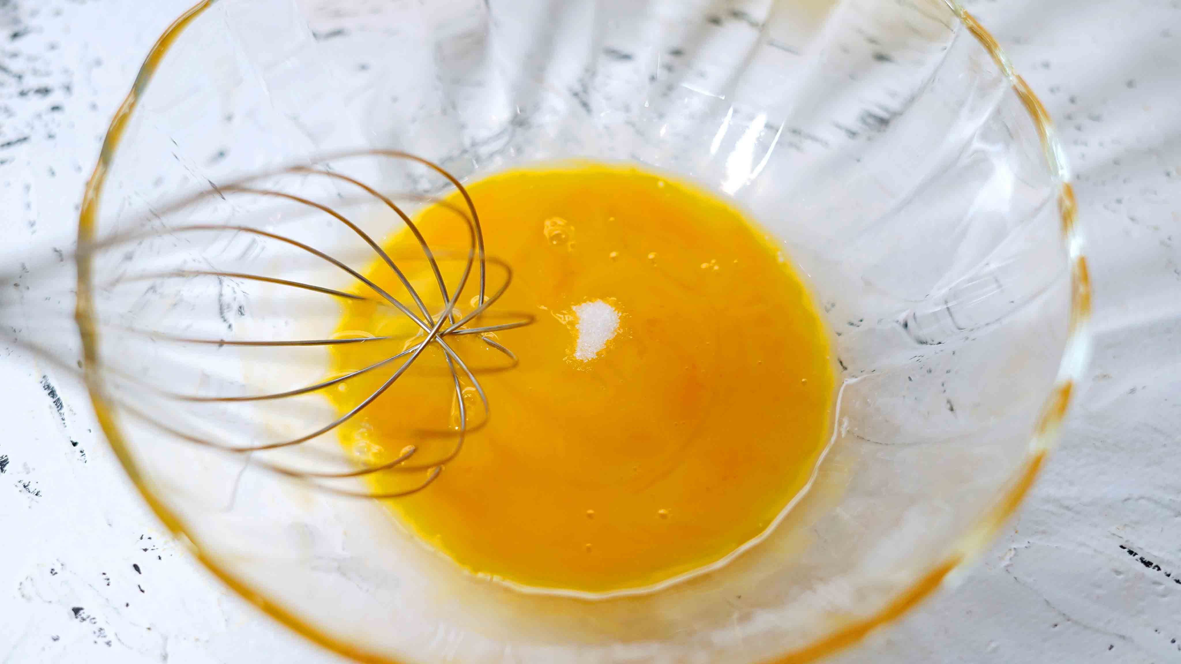 1、鸡蛋打散,20g细砂糖分3次加入搅拌均匀。