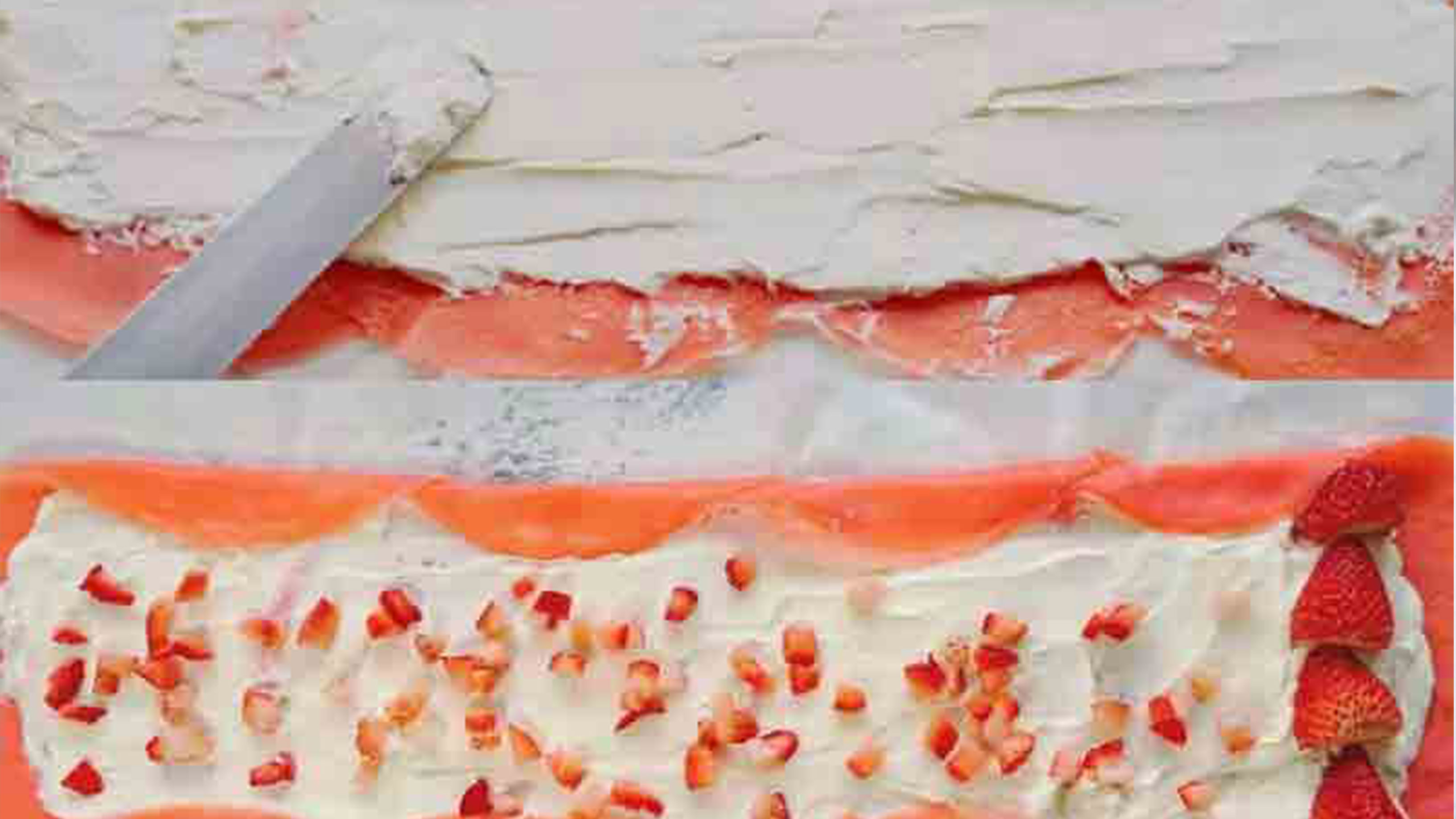 7、铺上一层油纸把饼皮一张叠一张地铺好,涂上淡奶油用抹刀抹平,然后放上切好的草莓,再将叠加线以外的皮向内折。