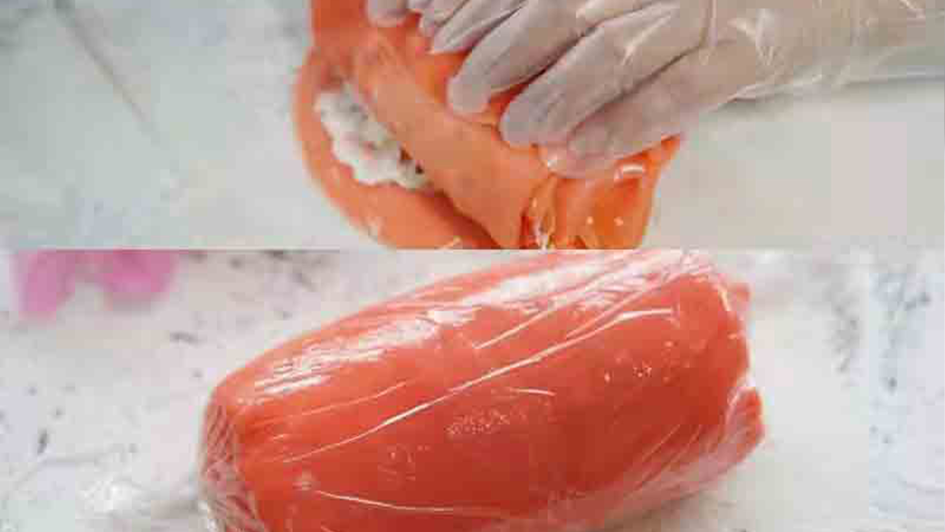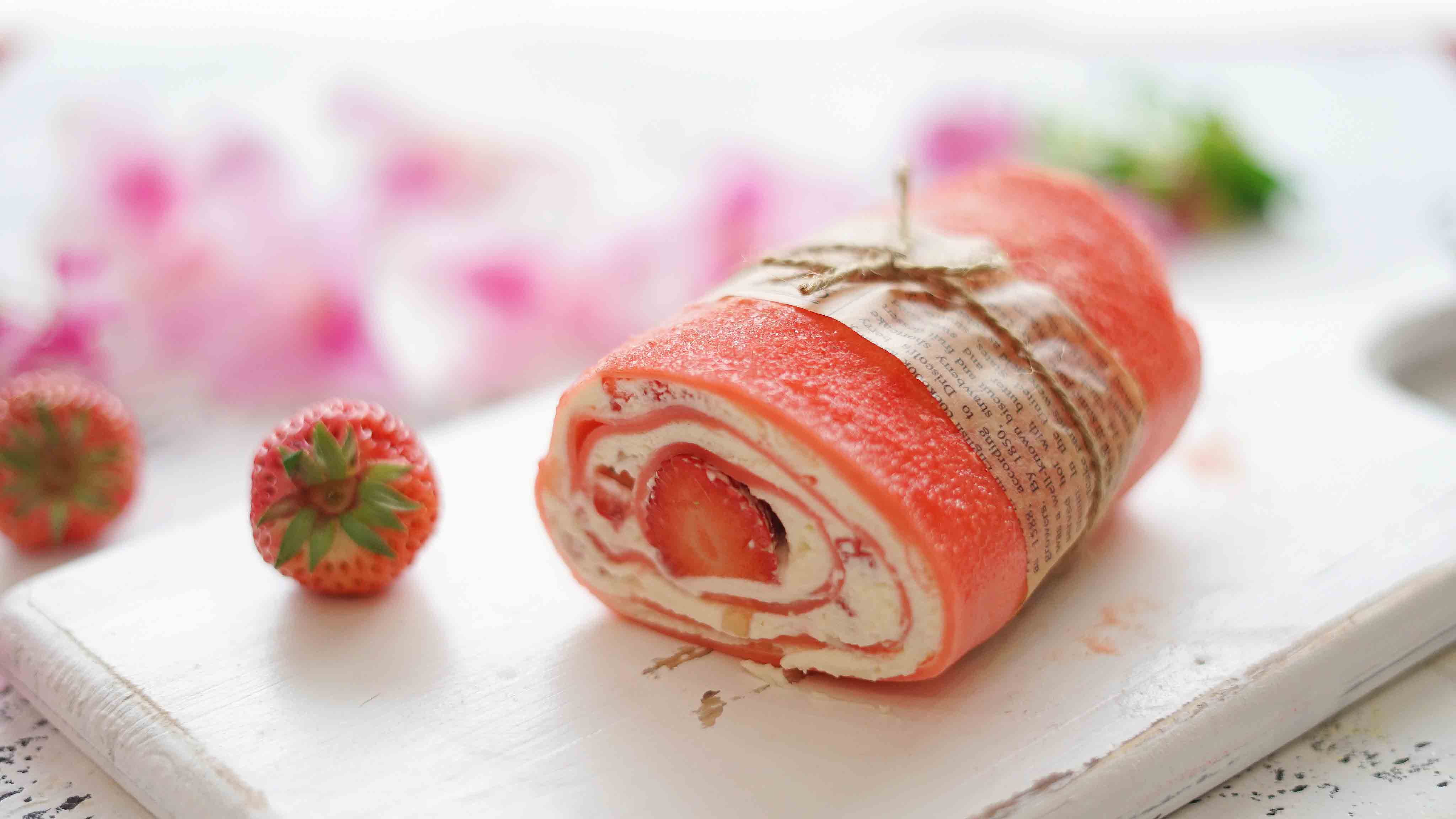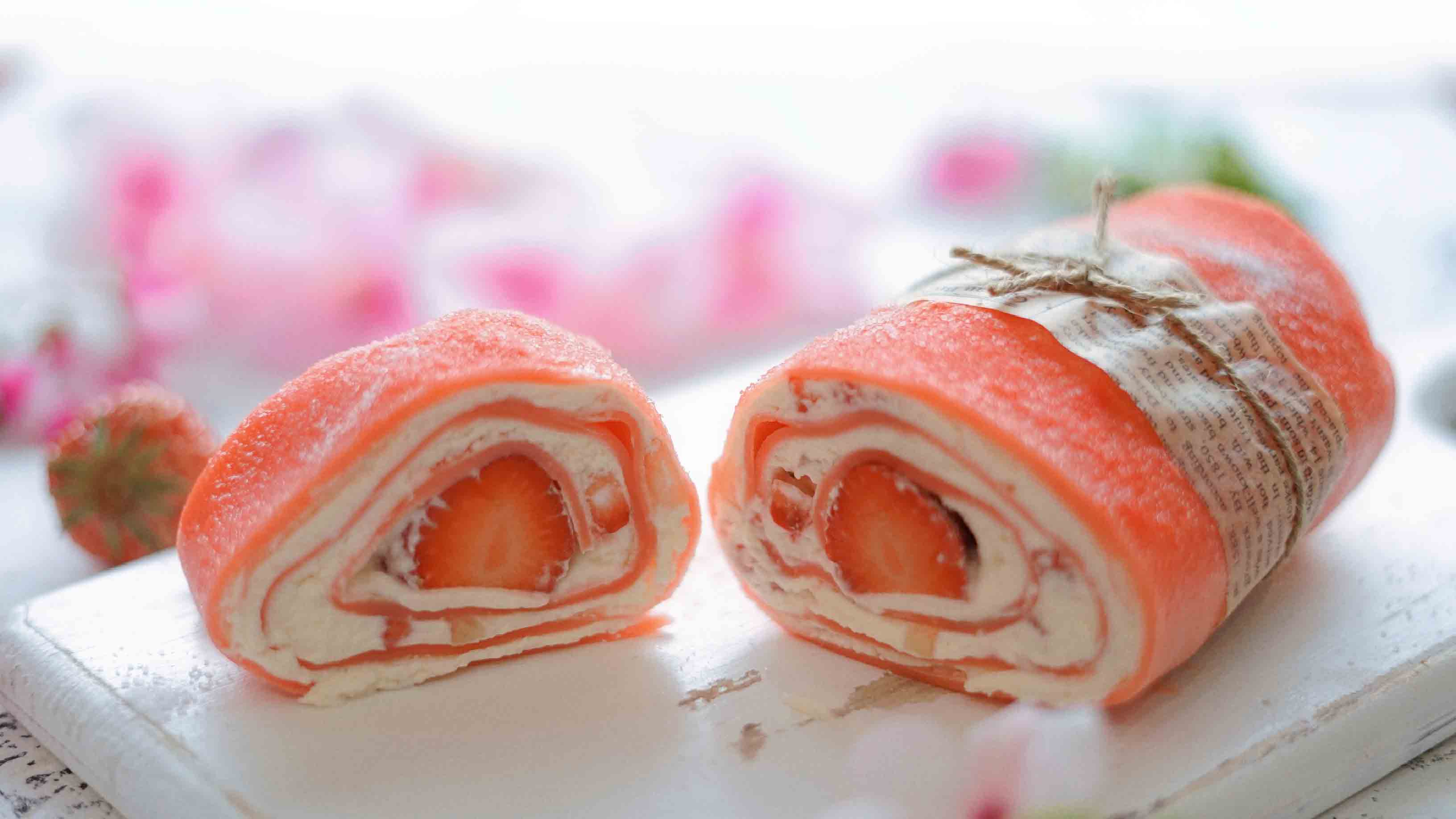 8、由一端慢慢卷起来然后用保鲜膜包起来,冷藏1小时。