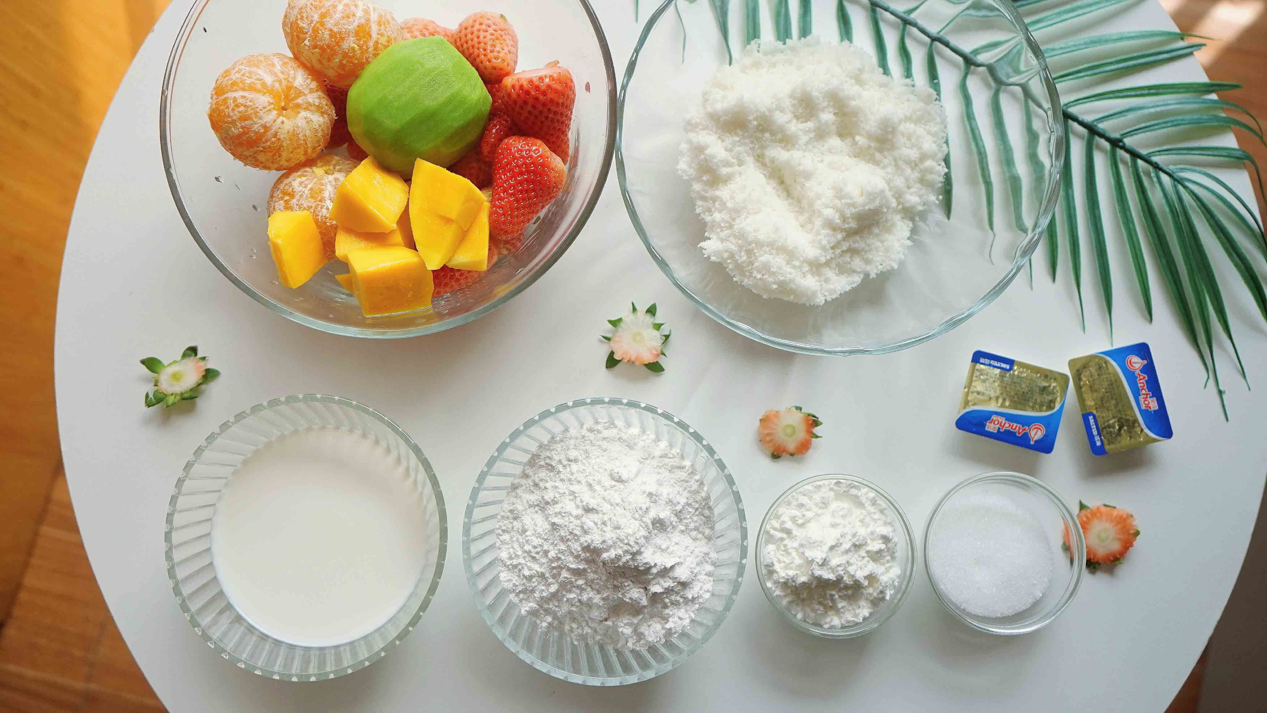 1、准备食材(糯米粉120克、玉米淀粉30克、牛奶170克、糖25克、黄油 15克、手粉、水果)。