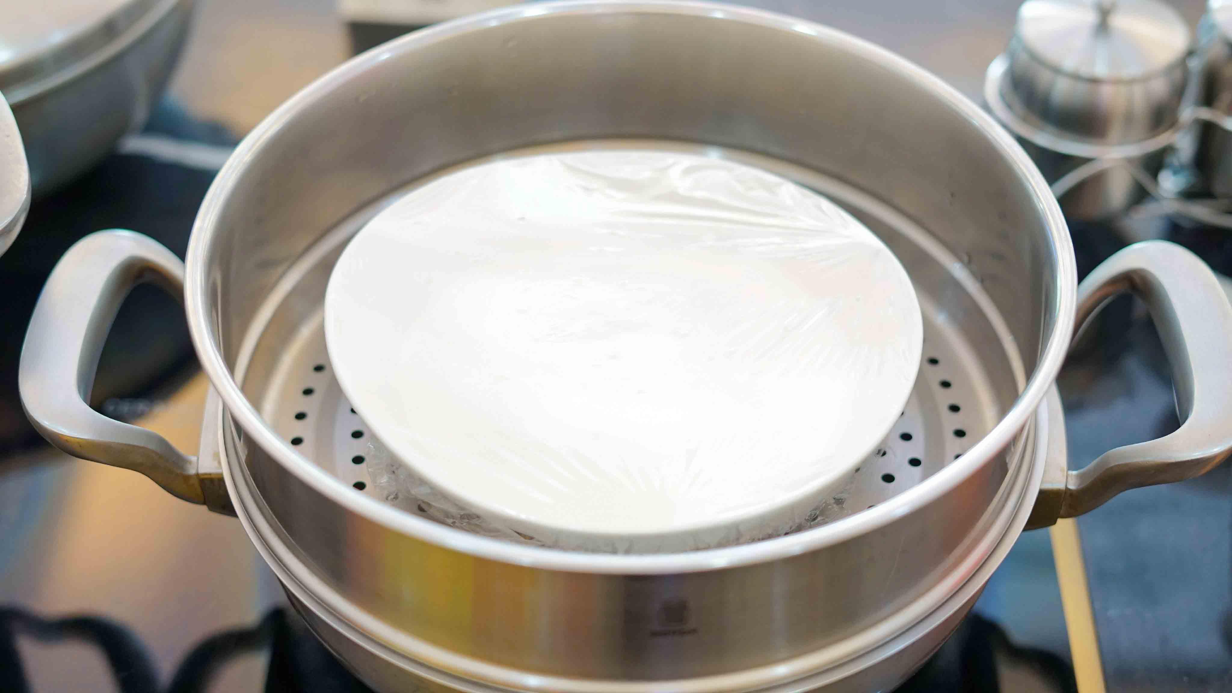 3、盖上保鲜膜,用牙签扎几个洞,中火蒸25分钟。