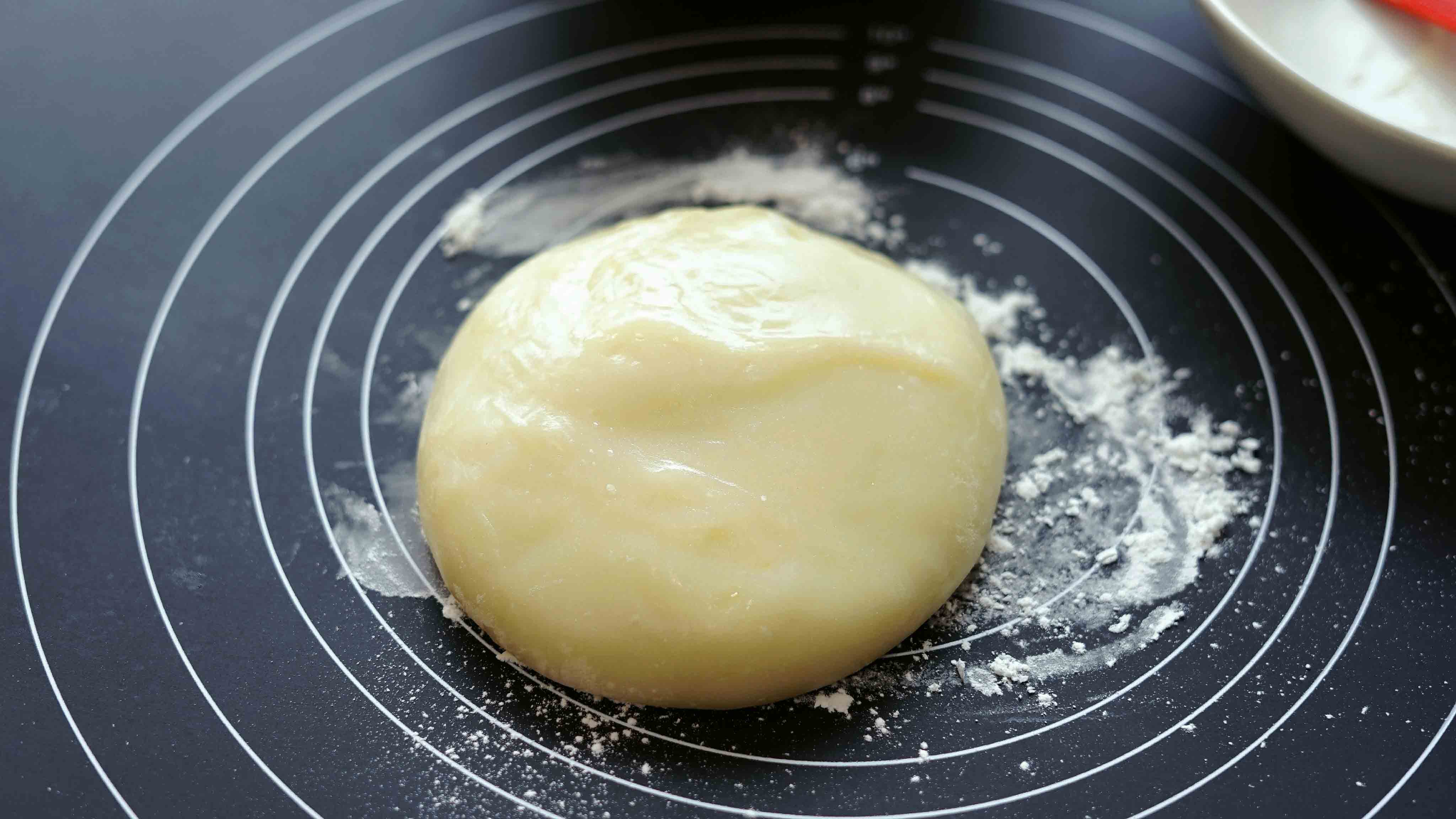 5、黄油和糯米团融合后,就转移到案板上,案板需要撒一些手粉防粘,戴上手套揉成一个稍微光滑一点的糯米团。