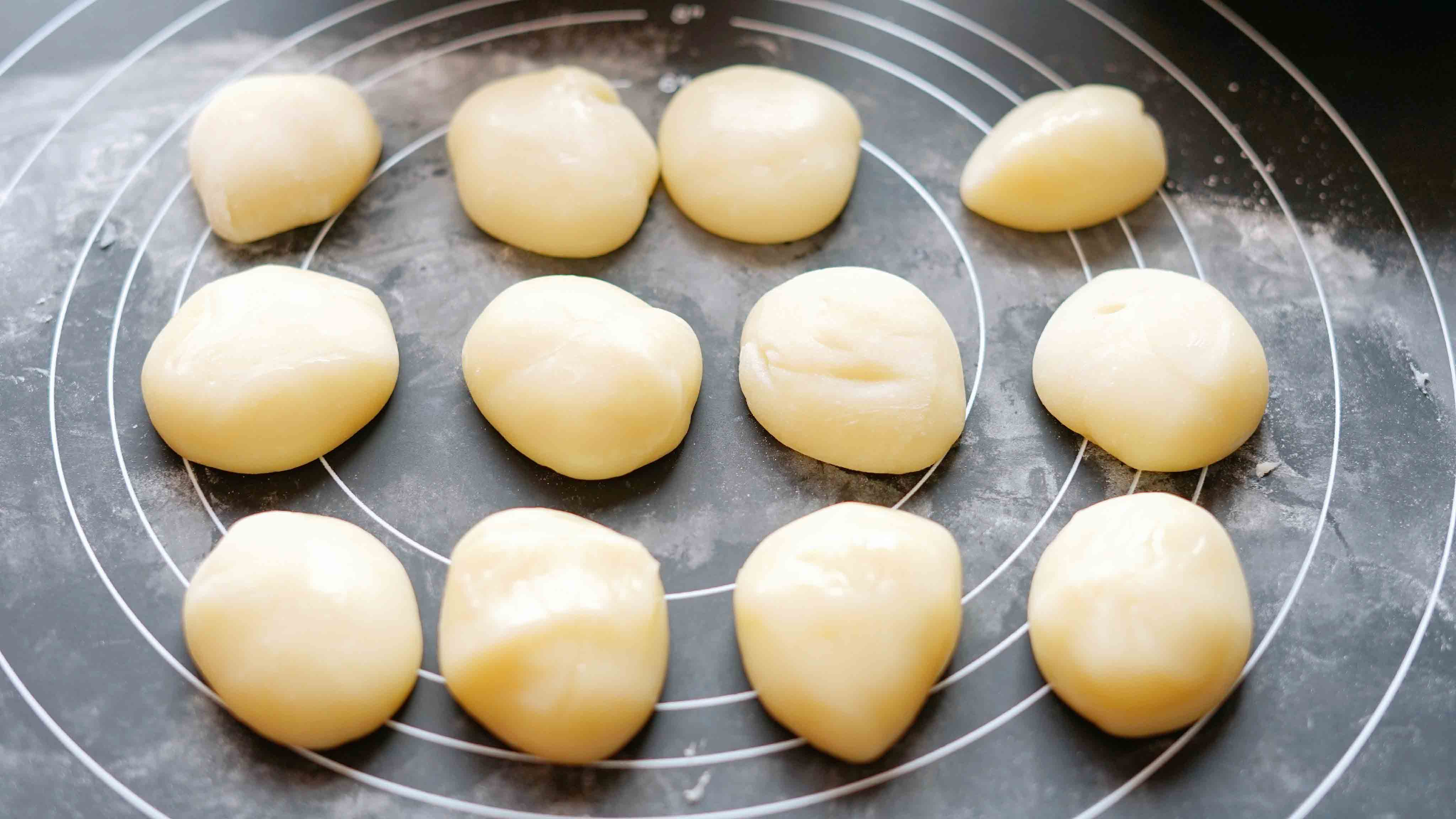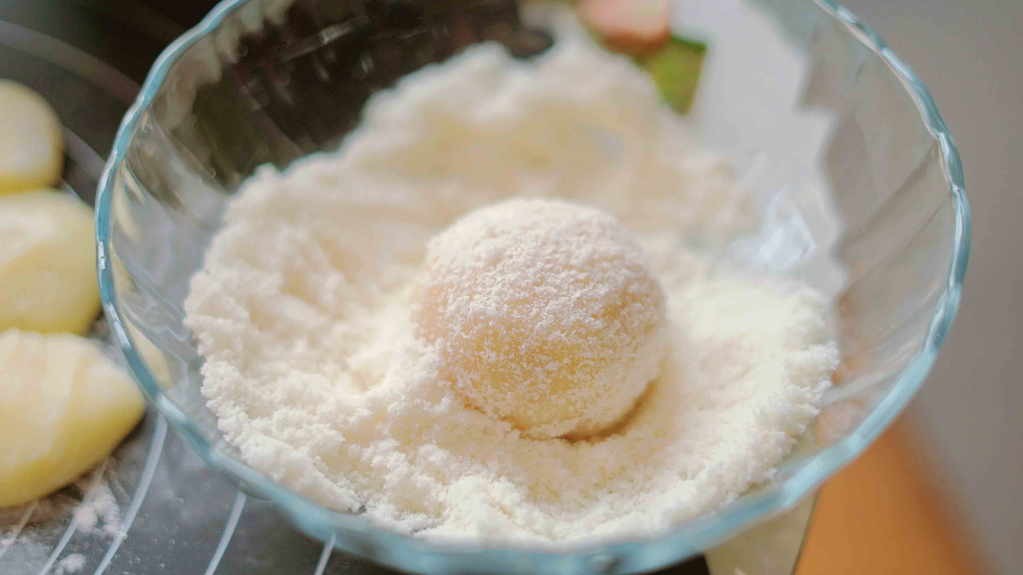 ⑤糯米糍上面裹上椰蓉可以防止粘手,也可以增加椰奶香味,家里没有的话,直接撒上一层手粉就好了。