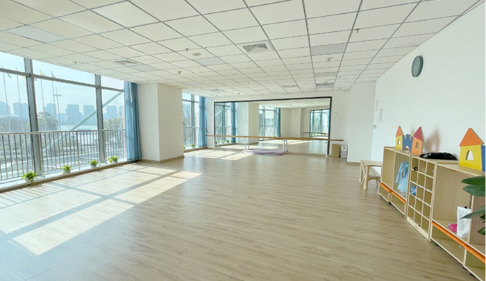 在舞蹈房,有超大的面积的落地窗和镜子,能够使幼儿宽松自在地徜徉于活动中,感受韵律之美。