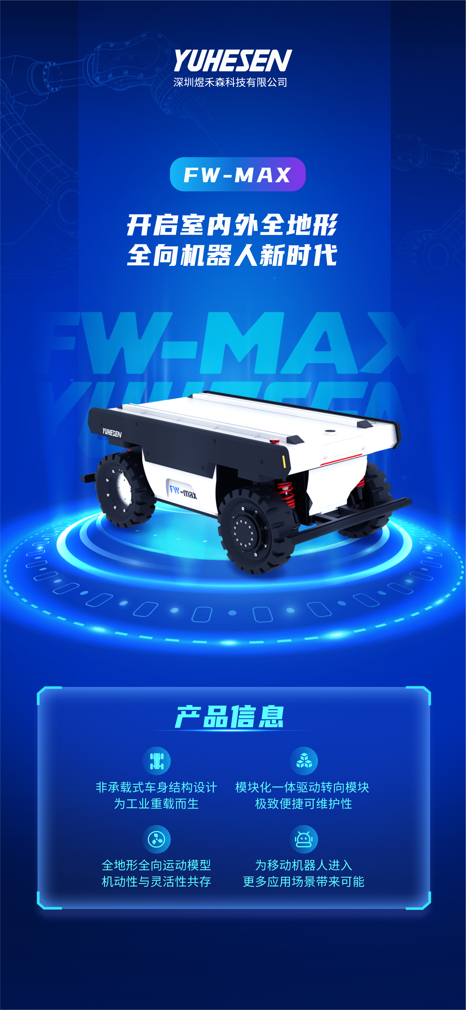 从2017年,煜禾森机器人开发出了第一代原型机4X4户外全地形四转四驱,而在此之后的7年时间中,经过多达上千次的结构优化从车规级部件测试优化到整车性能测试优化、从电机性能测试、传感器防撞测试、电池充放电测试、疲劳强度测试、复杂路况高强度测试、等一系列极端条件测试,只为了打造一款真正满足工业应用需求标准,具有灵活性高,承载力强,全面适用性以及高精度的四转四驱底盘。