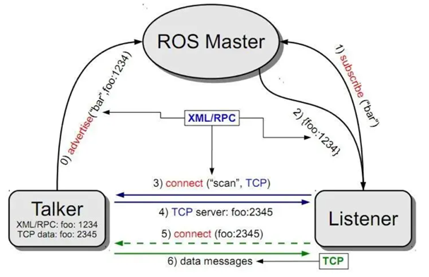 通过DDS实现不同节点的相互发现,当一个节点启动后, 它会向其他拥有相同ROS域名的节点进行广播,其他节点在收到广播后返回自己的相关信息来建立通信,节点会定时广播它的信息,在下线前它也会广播其他节点自己要下线了,只会和具有相兼容的QoS设置的节点进行通信