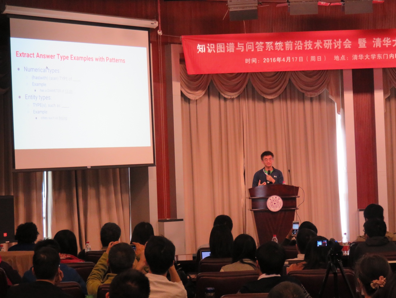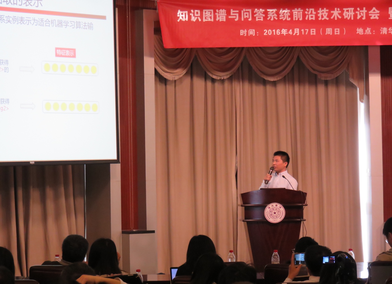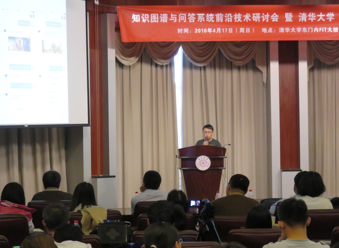 2016年4月17日,知识图谱与问答系统前沿技术研讨会暨清华大学“计算未来” 博士生论坛在FIT大楼多功能报告厅召开。本次研讨会由中国中文信息学会语言与知识计算专业委员会、中国中文信息学会青年工作委员会青工委和清华大学计算机科学与技术系联合举办。研讨会由清华大学李涓子教授、中科院自动化所刘康博士和清华大学刘知远博士担任主席,博士生论坛由林衍凯同学担任主席。 研讨会邀请多位在知识图谱领域享有盛名的学者专家进行专题报告,他们是:自然语言处理著名学者、前Google高级科学家林德康博士,中科院软件所副研究员韩先培博士,文因互联网创始人鲍捷博士,中科院自动化所副研究员刘康博士,百度自然语言处理部高级研究员马艳军博士。研讨会还邀请清华大学4名博士生同学和中科院自动化所2位博士生同学做口头报告,以及11名清华大学的博士生同学做海报展示。 本次研讨会共吸引了学术界和产业界200余名老师和同学参加,会场座无虚席,学术交流气氛浓厚。研讨会首先邀请林德康博士做了题为“From Search Engine to Answer Engine”的特邀报告,介绍他在谷歌研制自动问答系统的实践经验与思考。接下来,研讨会分 “知识图谱的构建与表示”和“智能问答系统”两个专题,分别开展了深入的报告与热烈的研讨。与会老师和同学均表示收获颇丰。 报告会安排: