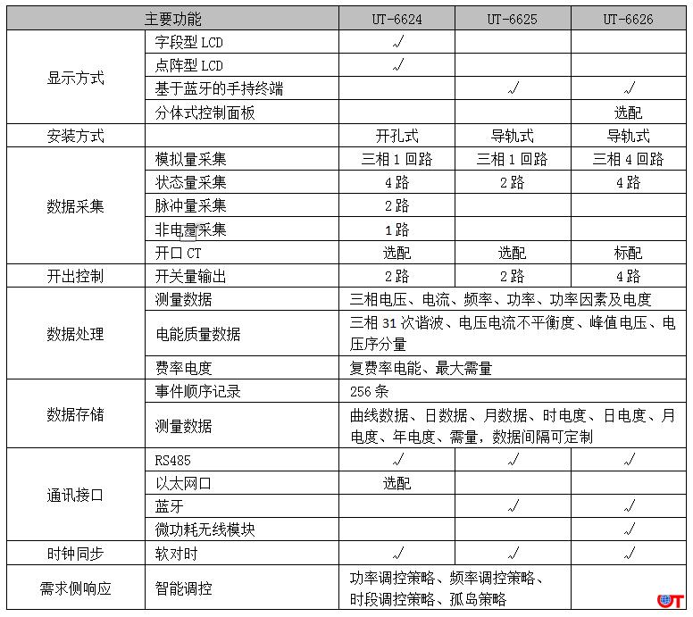 UT-6620系列智能用电监控终端产品包括UT-6624智能用电监控终端、UT-6625智能用电监控终端、UT-6626多回路智能用电监控终端,覆盖了面板安装与导轨安装、单回路监测与多回路监测、普通CT接入与开口CT接入、有线通信与无线通信、控制面板调试与手持设备调试等多种应用模式,产品详情见下表: