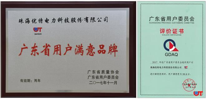 2017年6月,经广东省用户委员会组织,以优特科技的用户作为调查对象,对珠海优特电力科技股份有限公司进行满意度测评,用户满意度为99.8分。2017年11月10日,经广东省质量协会、广东省用户委员会审定,决定授以珠海优特电力科技股份有限公司“2017年度广东省用户满意品牌”称号,并现场颁发了荣誉证书和牌匾。