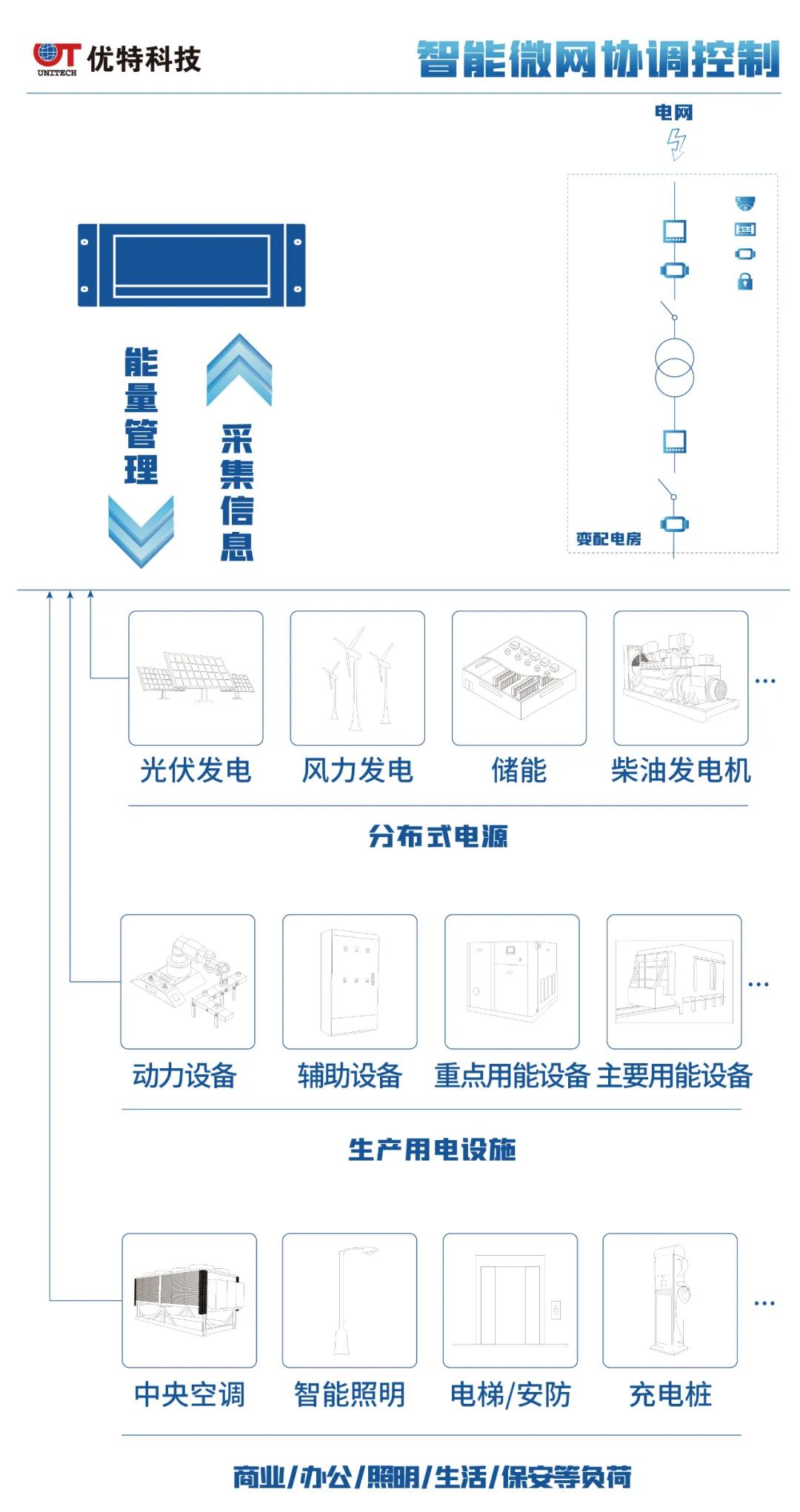 为协助解决这一问题,助力传统电网向智能电网过渡。智能用电解决方案中的微电网可以对能量进行智能控制和自动调度,以最大化可再生能源利用为目标吸纳分布式电源的出力,促进电力供需平衡并支持电网调峰,实现能源灵活、高效应用,避免造成浪费。