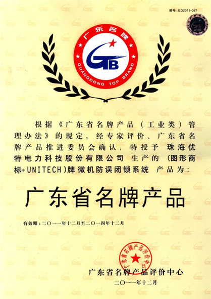 “广东省名牌产品”认定有效期三年,对于不符合认定条件的产品将在再次认定评审中被除名。优特公司的微机防误闭锁系统系列产品再次获得“广东省名牌产品”认定,体现了对优特公司“技术实力、产品性能”创新理念、和 “质量和服务的认可。今后,公司将不断加强技术创新,不断研发新品,为广大用户提供更可靠稳定的产品和服务。
