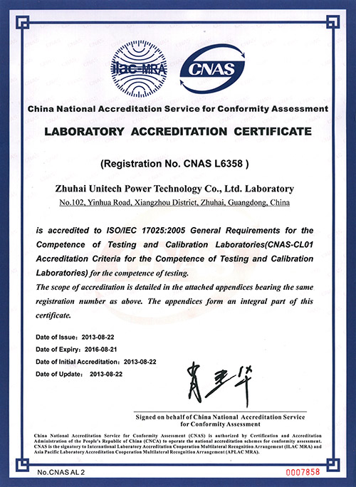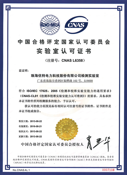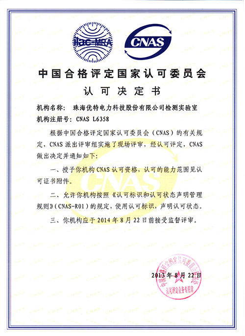 8月22日,中国合格评定国家认可委员会(CNAS)正式通知:珠海优特电力科技股份有限公司检测实验室已获得CNAS认可,实验室可在获得认可能力范围内获准使用CNAS国家实验室认可标志和ILAC国际互认联合标志。