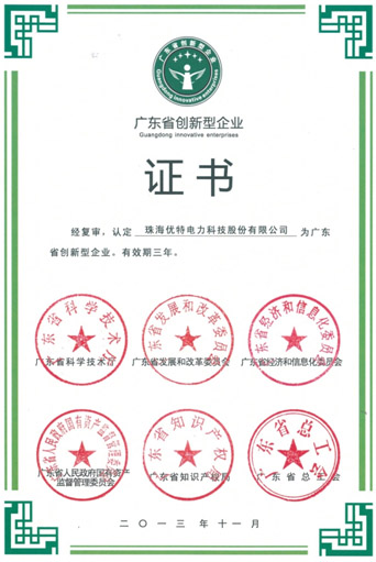 近日,珠海优特电力科技股份有限公司在广东省科技厅、发展改革委、经济和信息化委、国资委、知识产权局和总工会六部门联合开展的广东省创新型企业评选工作中,凭借自身技术实力和创新能力,成功被评为“广东省创新型企业”。