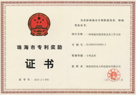5月29日,珠海市科学技术奖励暨创新型城市建设工作会议在珠海市人民政府隆重召开,珠海市委书记李嘉、市长何宁卡等领导出席会议并为获奖者颁奖。珠海优特电力科技股份有限公司的发明专利“一种智能闭锁系统及其工作方法”,被授予“珠海市专利金奖”。