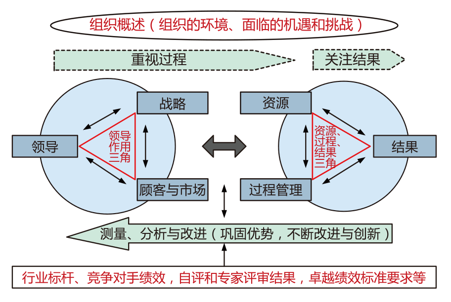 与ISO9000等体系不同,“卓越绩效”关注的是体系质量和经营管理的综合绩效,是对经营管理的各个方面不断“总结——评价——改进”的“循环提 升”,从而不断超越行业标杆、超越竞争对手、超赿自我的过程。为顾客、员工和其他相关方不断创造价值,提高组织整体的绩效和能力,促进组织获得持续发展和 成功。