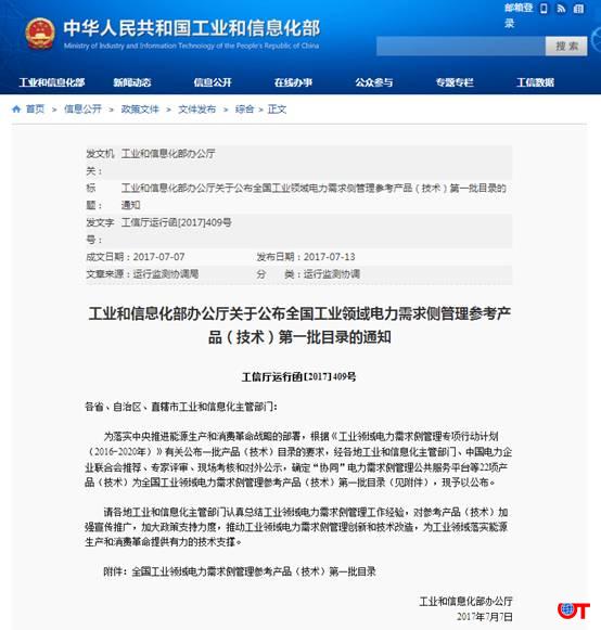 2017年7月13日,优特科技UT-D100C智能电网配用电协调控制系统/UT-D100C63能效协调管控系统又凭借十多项创新专利技术,被正式列入工业领域电力需求侧管理产品(技术)参考目录,成为首批获工信部推荐的企业之一。