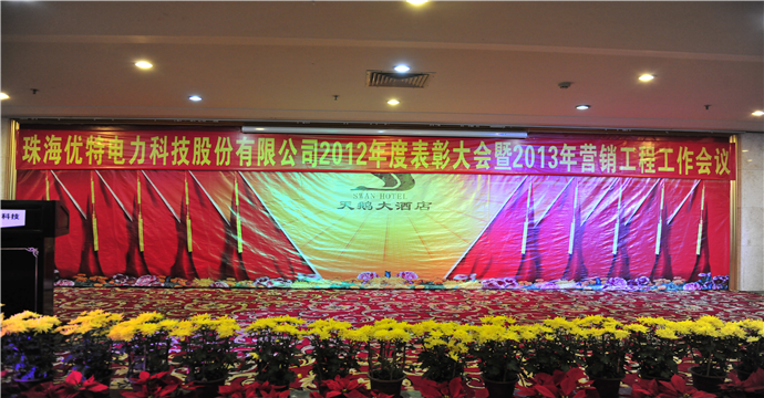 • 2013年2月19日上午9点,珠海优特电力科技股份有限公司2012年度表彰大会暨2013年营销工程工作会议在天鹅酒店隆重举行,公司高层及部分获奖人员、销售人员、工程人员参加了此次大会。 延续每年的传统,本次会议颁发...