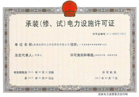 • 近日,经过国家电力监管委员会南方监管局认定,珠海优特电力科技股份有限公司通过了承装(修、试)电力设施许可审核,取得了承装类四级及承修类四级资质。 根据《承装(修、试)电力设施许可证管理办法》(国家电监会...
