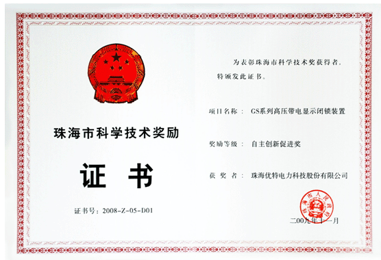 • 近日,根据珠海市人民政府《关于颁发2008年度珠海市科学技术奖的决定》,授予优特公司自主研发的“GS系列高压带电显示闭锁装置”珠海市自主创新促进奖。 Gs系列高压带电显示闭锁装置独具五防闭...