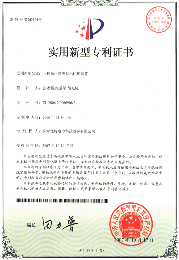 • 优特公司:一种无线高压带电显示闭锁装置获得实用新型专利证书