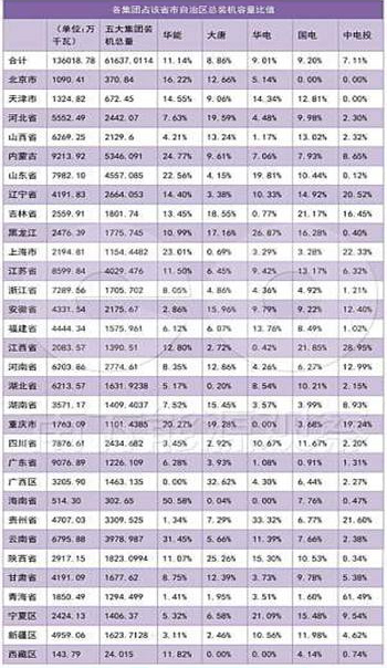国电的总装机容量在五大集团中仅次于华能,达12520万千瓦。但在全国范围内的装机容量分布较为均匀,仅江苏一省的装机容量超过1000万千瓦,只占了江苏省总装机容量的约13%左右。
