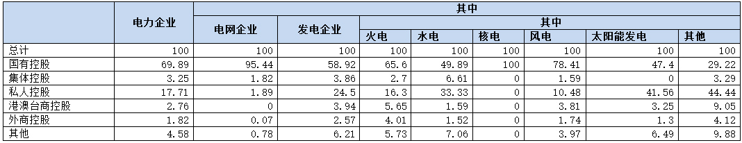 在全国规模以上发电企业中,国有控股的企业数占全部火电企业的65.60%,水电比例为49.89%,核电比例为100%,风电比例为78.41%,太阳能发电比例为47.40%;私人控股的这一比例分别为火电16.30%、水电33.30%、风电10.48%、太阳能发电41.56。