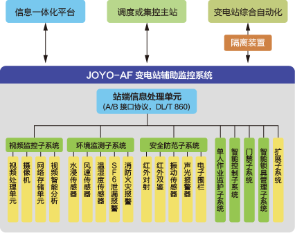 JOYO-AF辅助监控系统按业务划分主要由视频监控子系统、环境监测子系统、安全防范子系统、单人作业视频监护子系统、智能控制子系统、门禁子系统、智能锁具管理子系统等组成,可与变电站、集控和调度综合自动化系统、信息一体化平台等进行通信并实现互动。